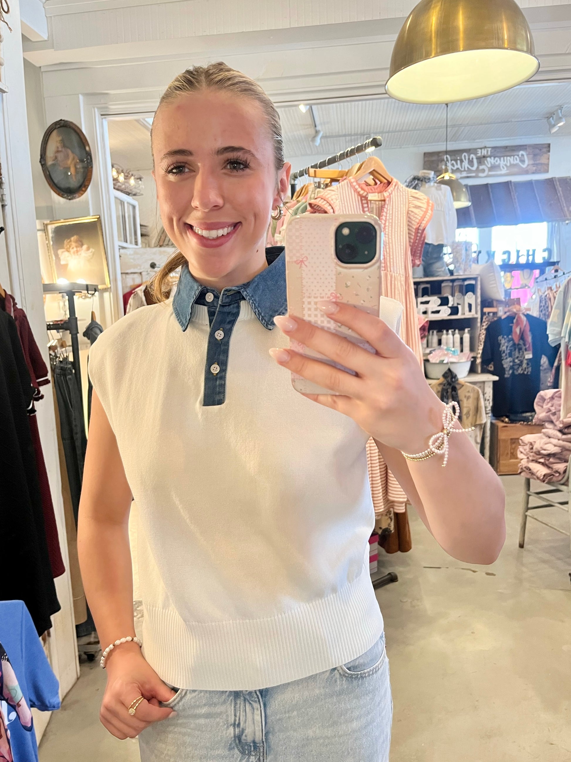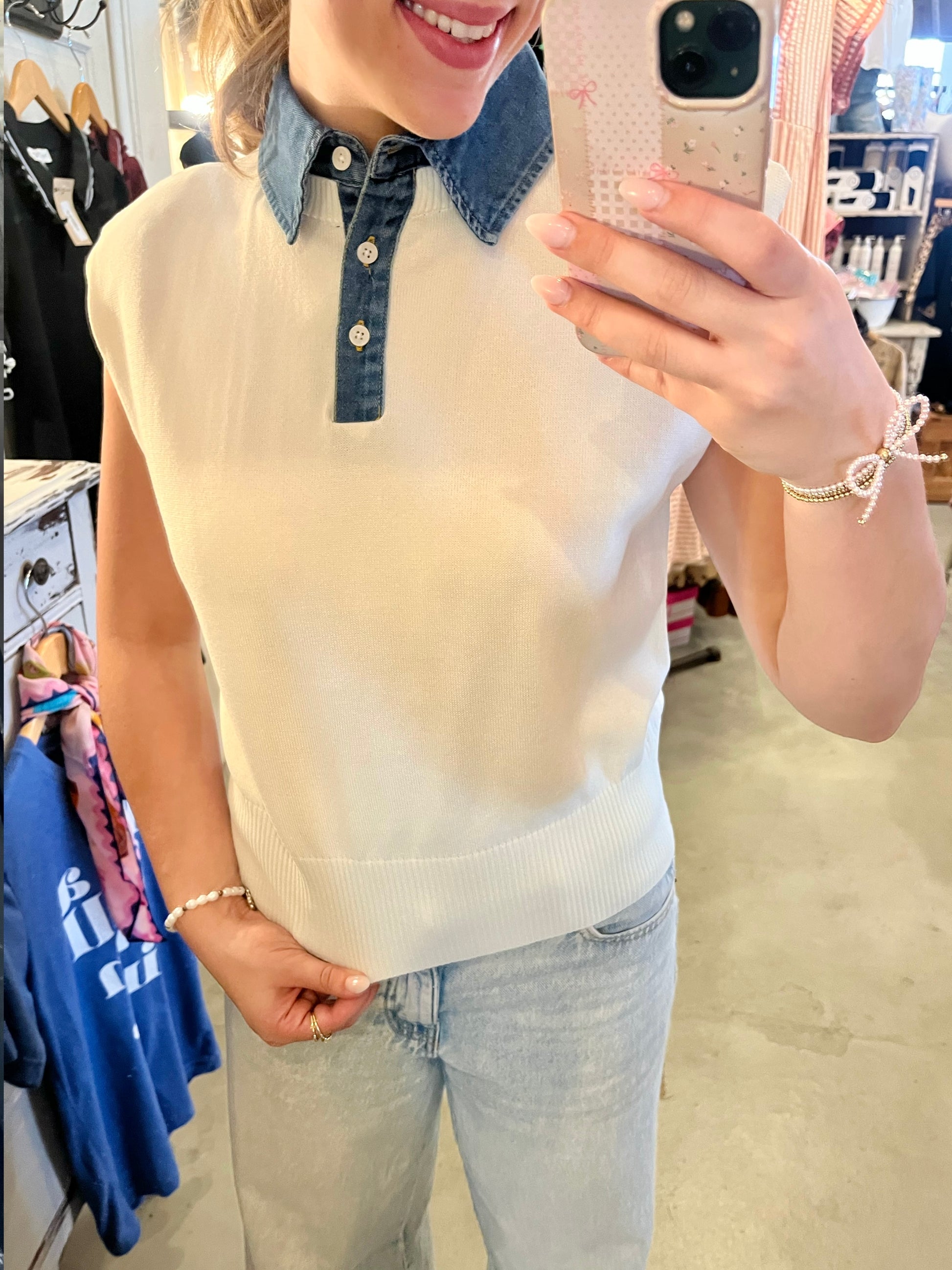 Elevate your casual style with Always Yours, featuring a stylish denim collar that buttons up against a classic white knit body. Perfect for adding a touch of sophistication to any outfit, this shirt combines comfort with a trendy look that’s sure to turn heads.