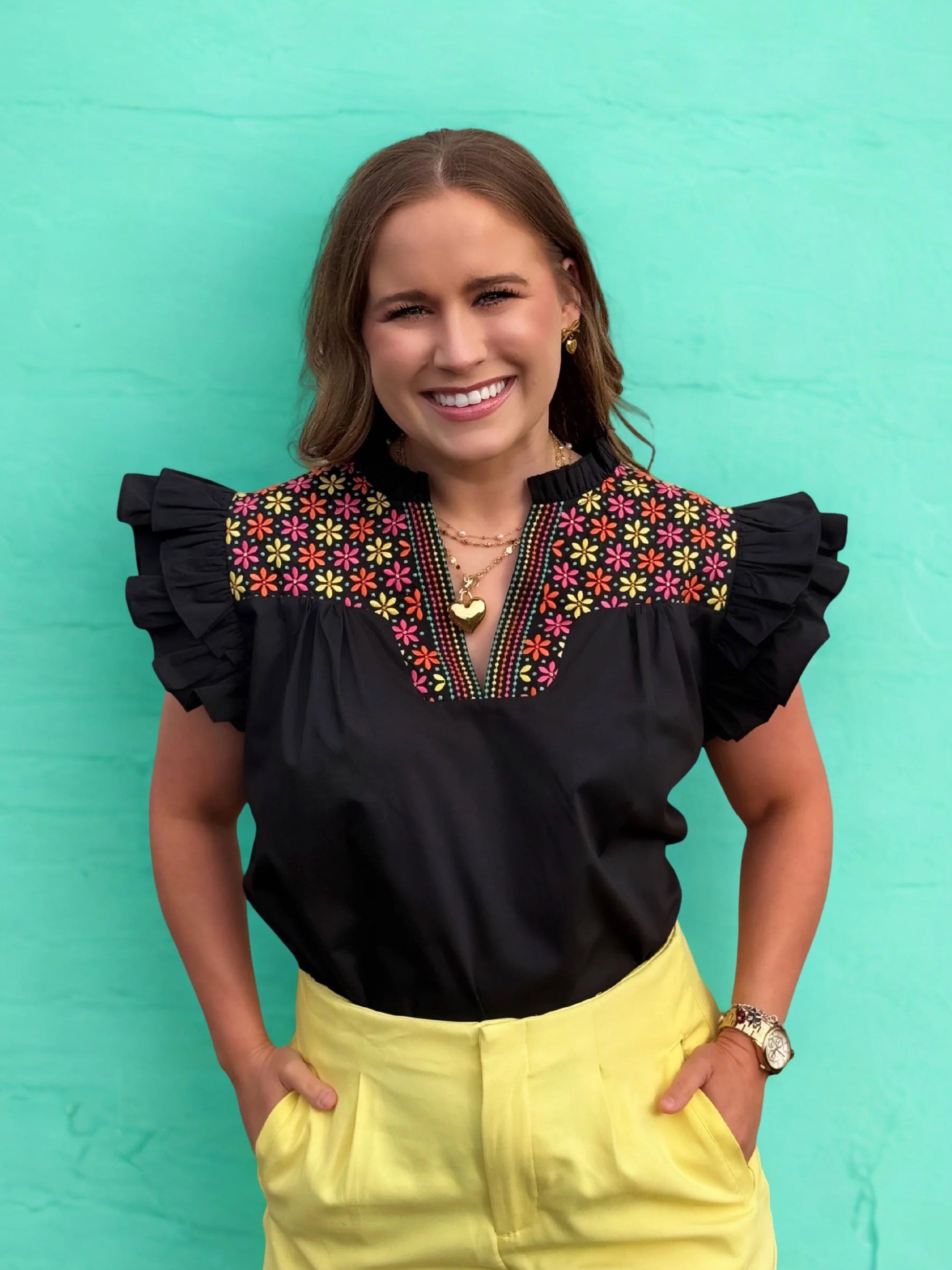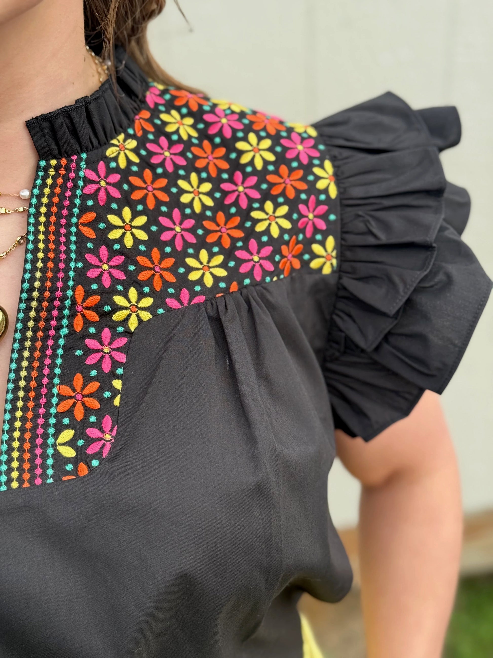 Unleash your playful side with the Amelia top! This solid black beauty features delightful ruffled sleeves and a v-notch neckline, perfectly complemented by vibrant embroidery that adds a cheerful pop. Ideal for any occasion, it effortlessly combines style with comfort for a standout look.
