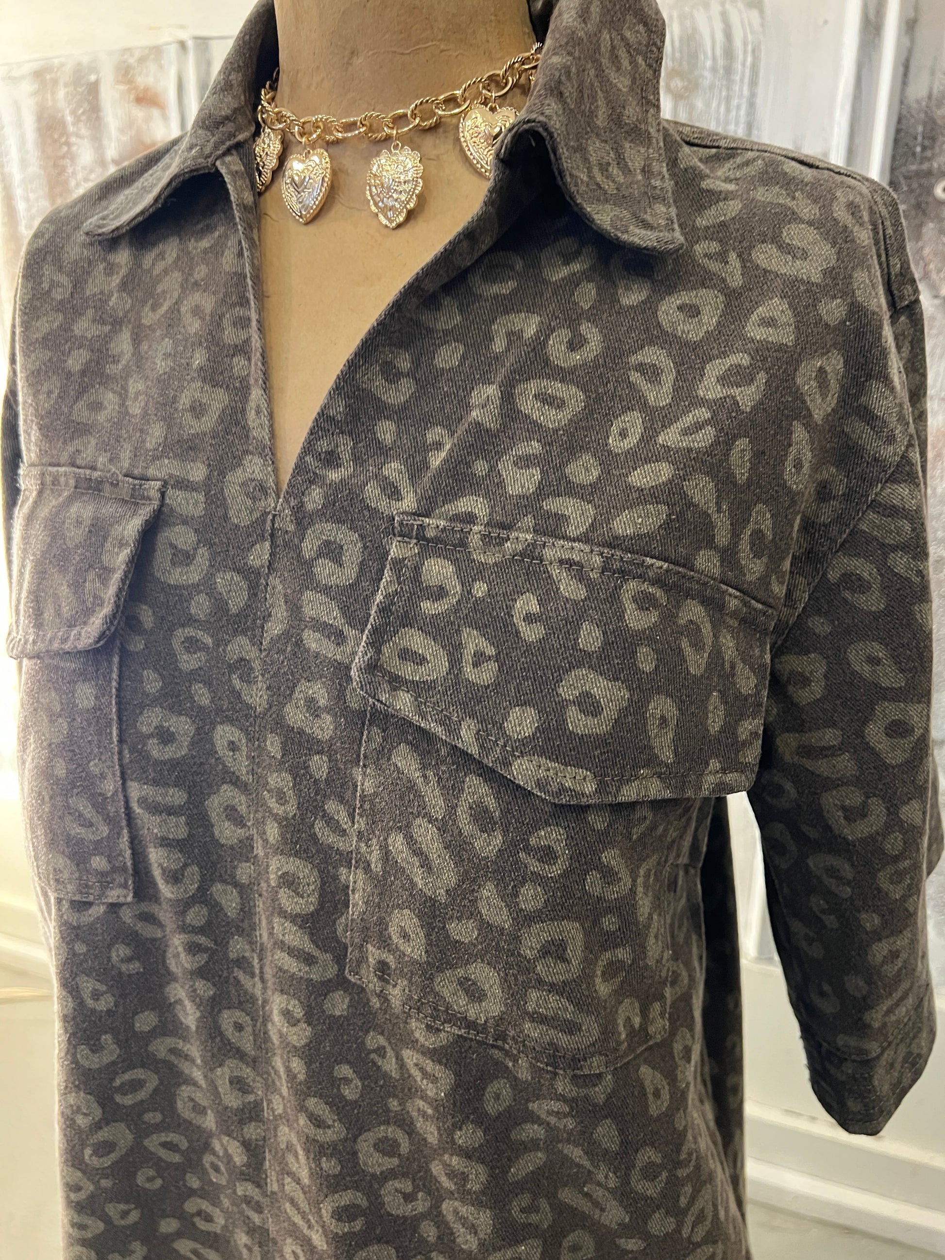 walk on the Wild Side in this mini dress with a collar that's got short sleeves, a washed animal print, some fancy stitching, and yes—pockets for all your wild adventures!
