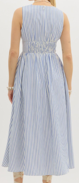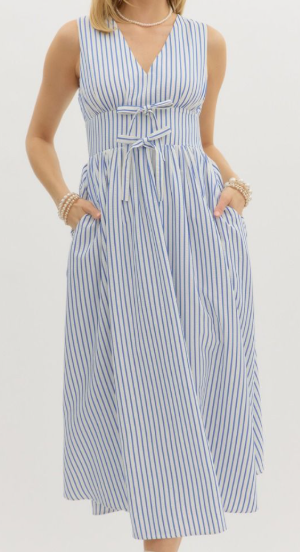 Twirl into summer looking Beautiful in Blue with this charming striped midi dress! The sleeveless design keeps you cool while the high empire waist creates a flattering silhouette. A playful bow accent adds a touch of whimsy, and the smocked back ensures a comfortable fit. Practical side pockets and full lining make this dress as functional as it is adorable!