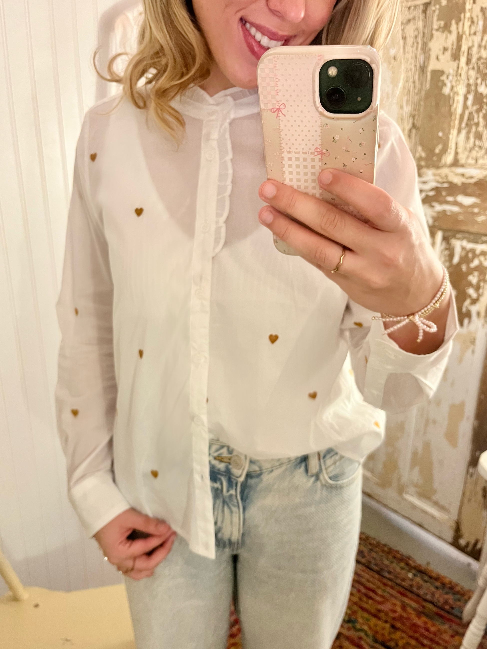 The Dylan Heart top with gold stitched hearts is perfect for a sweet everyday look or a great pick for Valentine’s Day too. It’s made of a sheer white fabric with long sleeves and a button up front. The ruffle collar and trim on the front add just the right feminine touch.