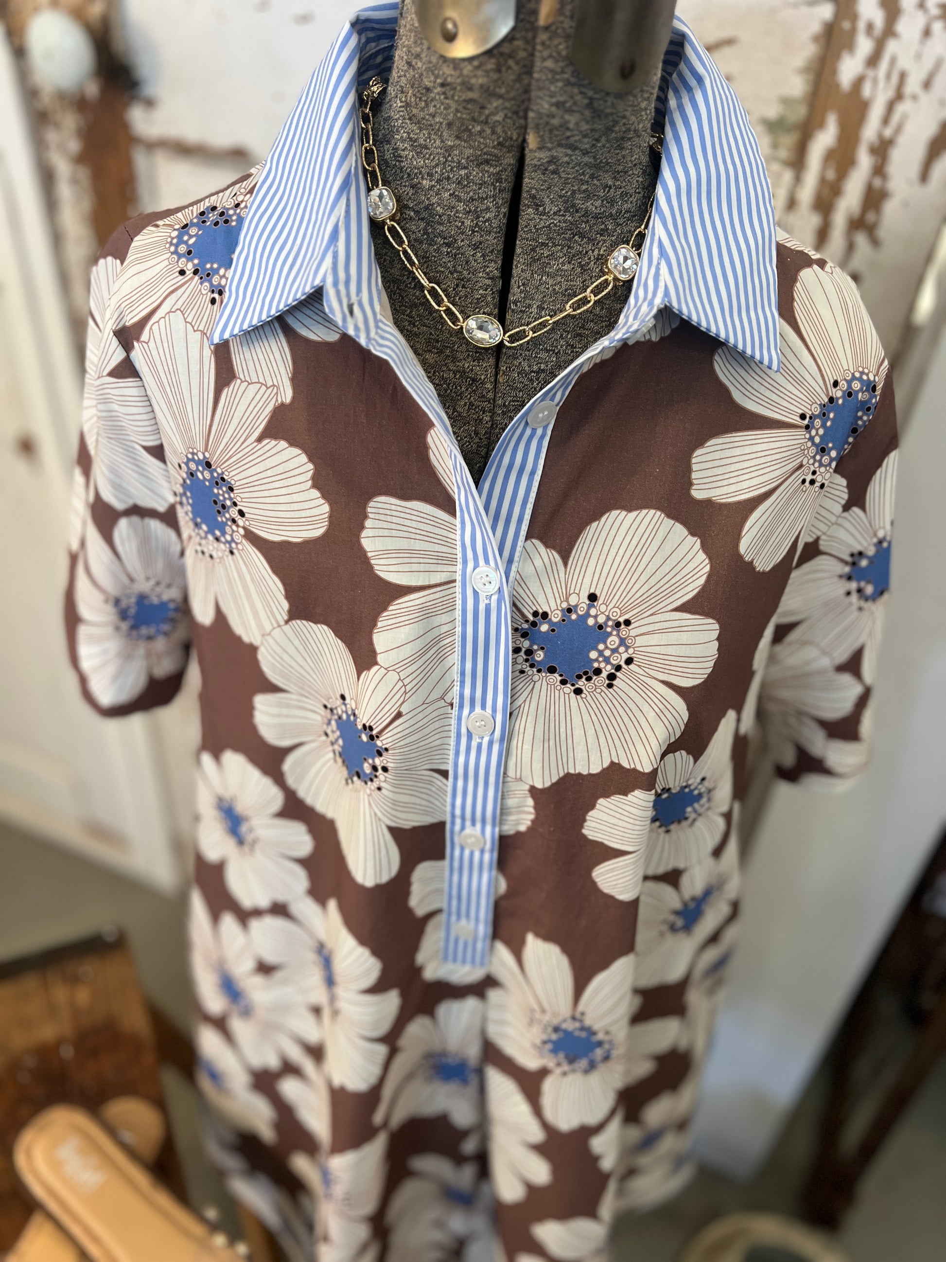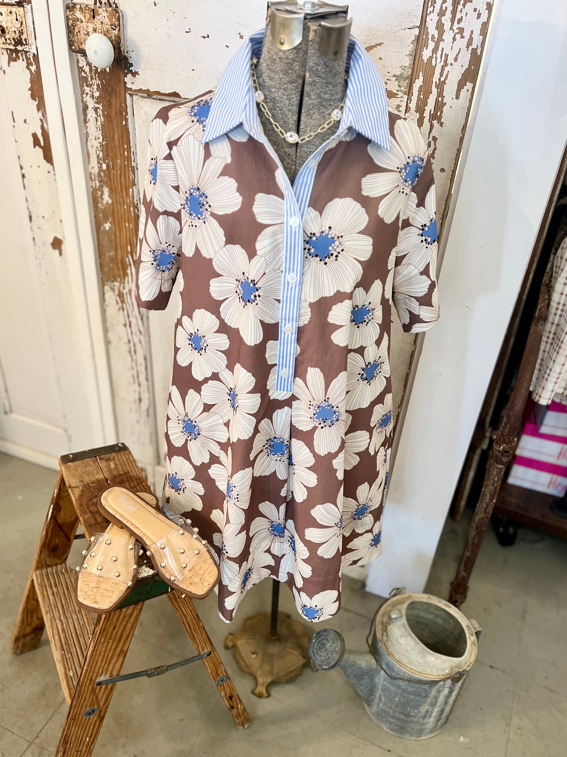Get ready for the day Bright & Early in the floral printed minidress. Featuring a pin striped collar neck and button front. The chocolate with cream floral is a classy print that makes a statement. Rock your day in this new arrival!