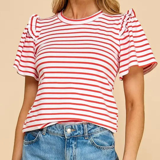 Bring It On Basic is a stylish off-white striped top featuring a refined round neckline and delicate shoulder ruffles, elevating it beyond the standard tee.