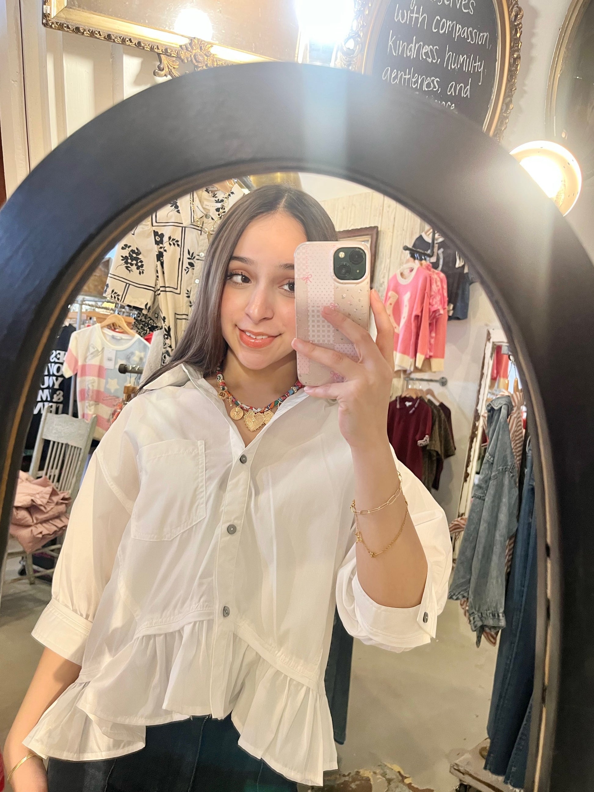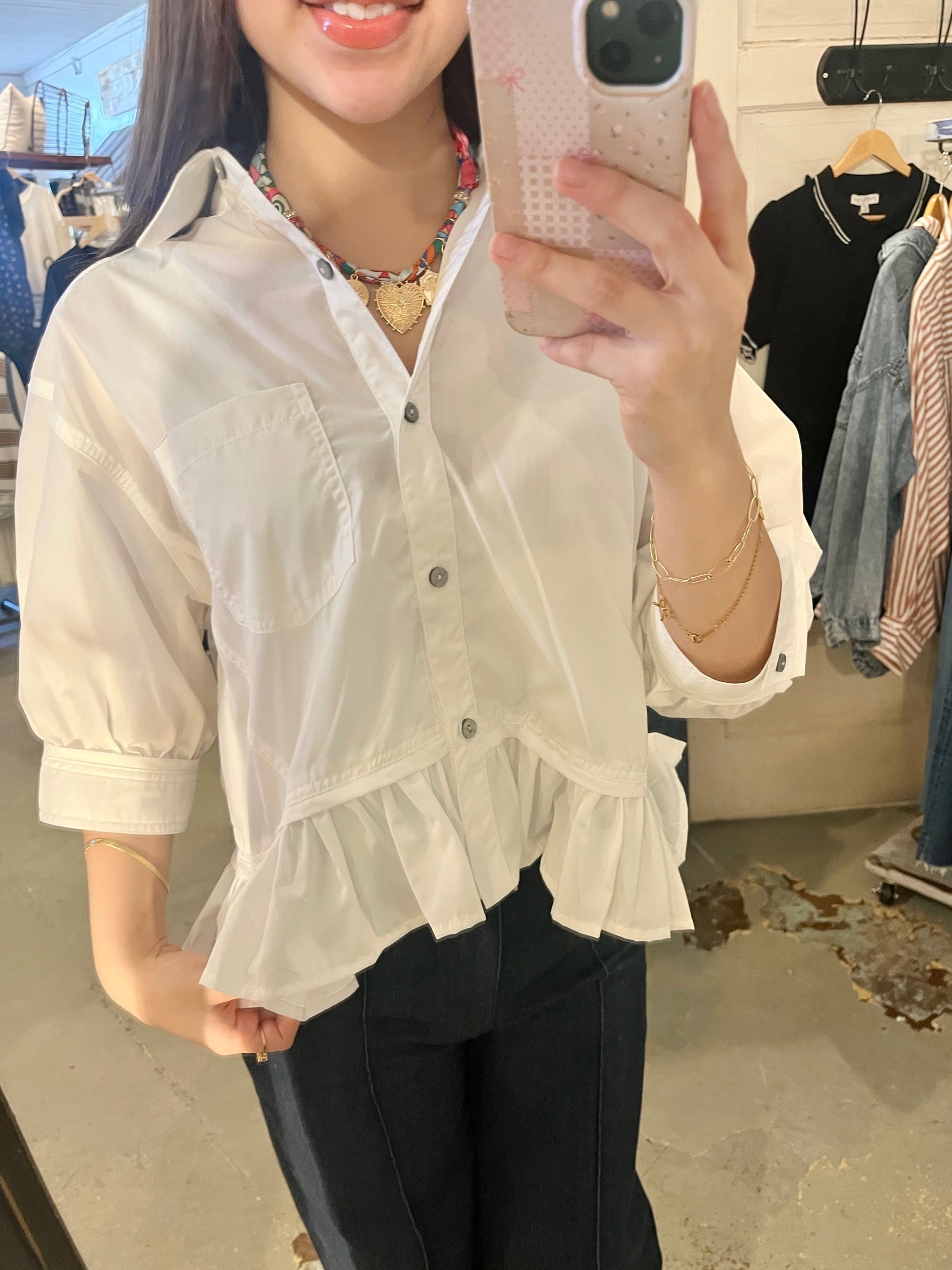 With its timeless appeal, the Classic Attraction shirt is a wardrobe stable. This crisp white button-up, accented with a playful ruffle bottom, adds a touch of fun to any outfit. Perfect for layering or standing alone, it’s a versatile piece that effortlessly combines style and comfort.