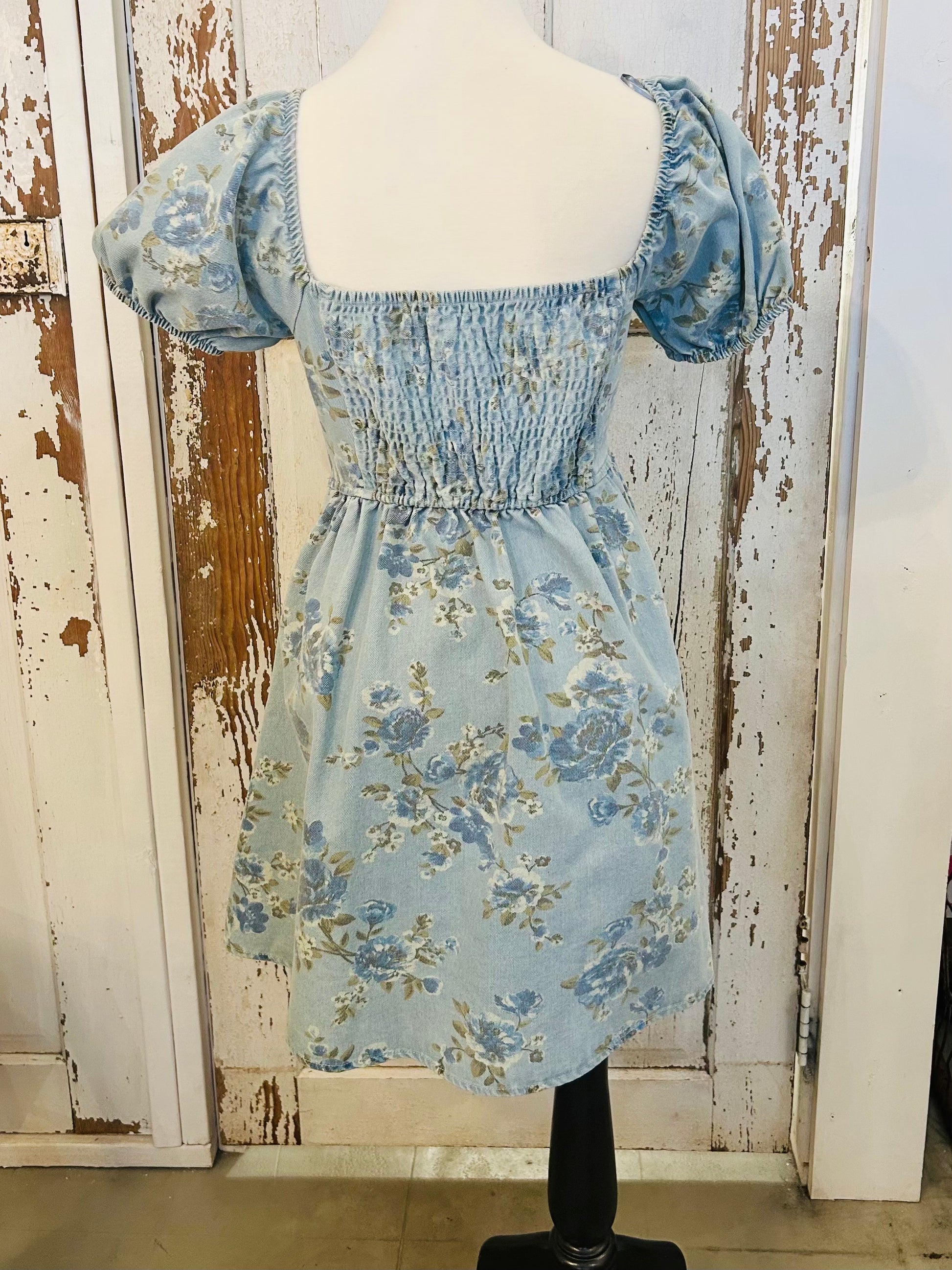 Step into style with the Fancy in Floral mini dress! This light denim piece features a delightful flower pattern and charming puffy sleeves, perfect for adding a touch of whimsy to your wardrobe. Embrace comfort and flair, making it easy to shine at any casual outing.