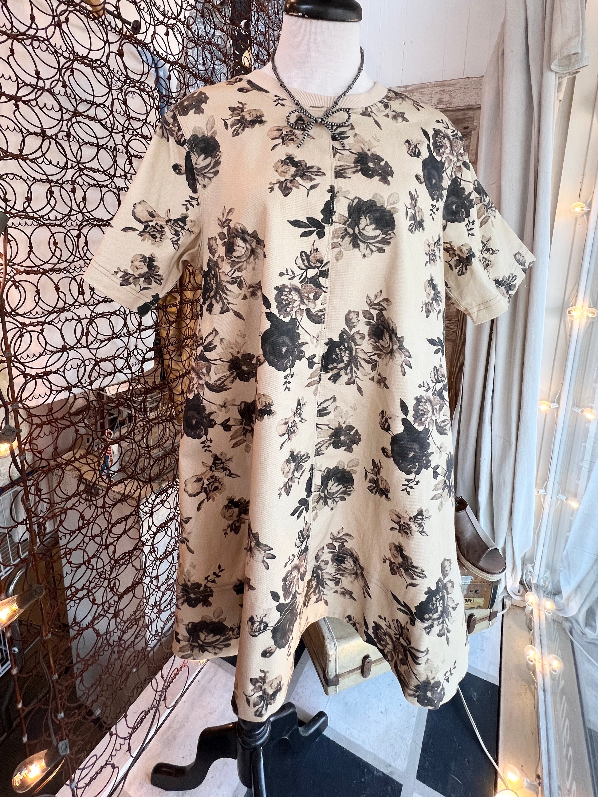 You will Feel the Joy in this taupe with charcoal floral dress. Zipper back detail with pockets for comfort and style. A must have for fall fashion CHICKS!!