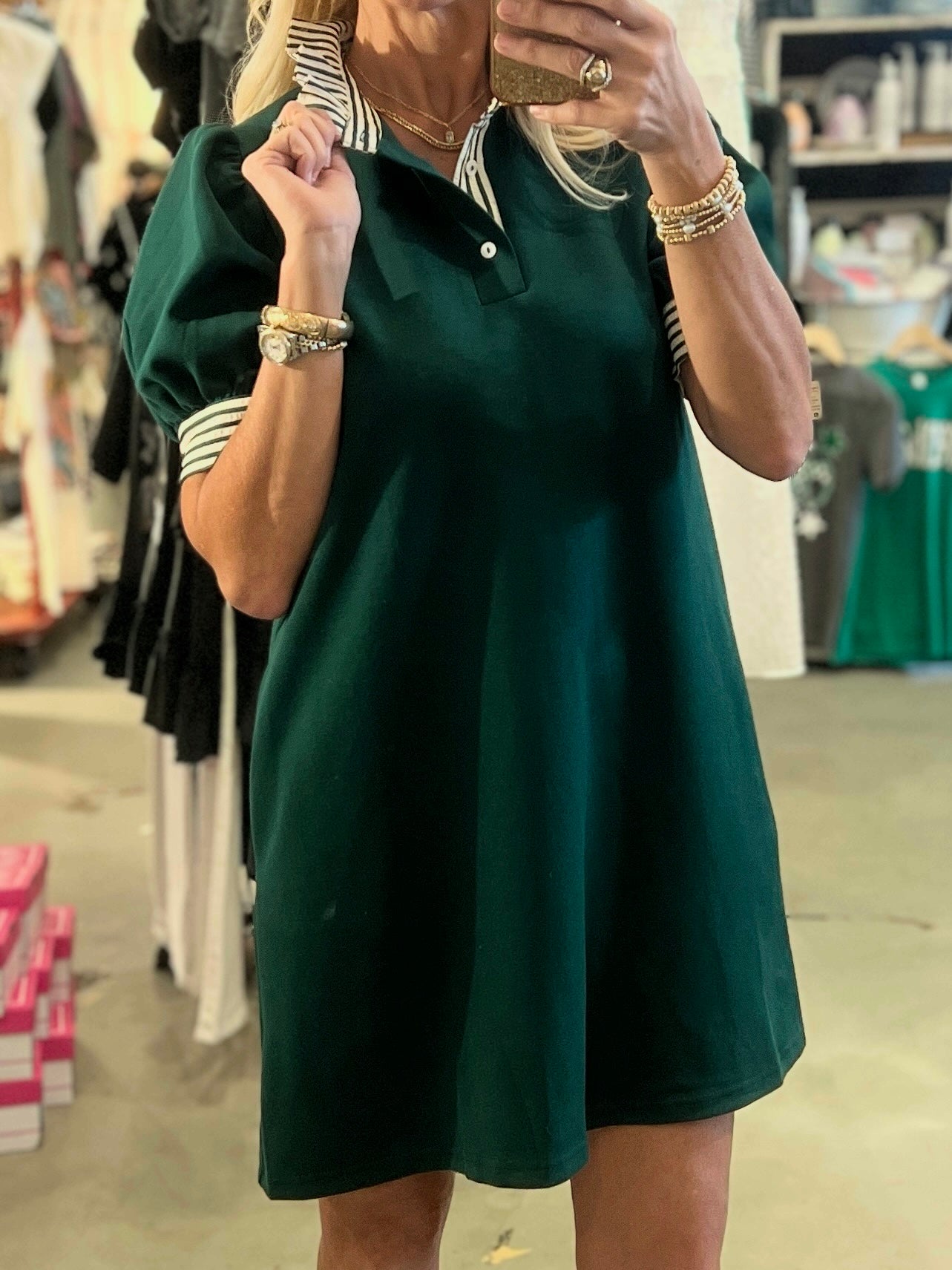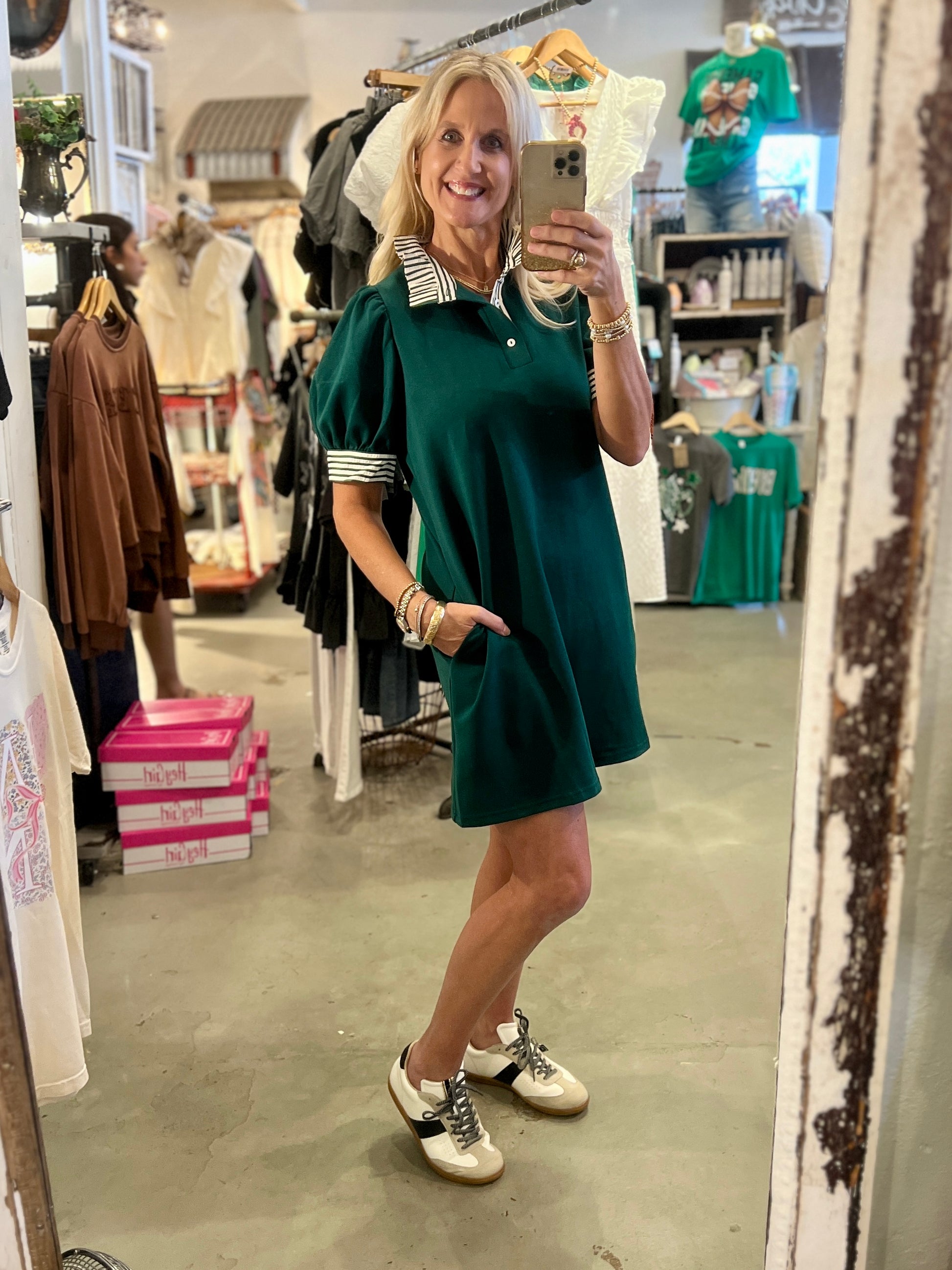 Stay comfortable and enjoy your Free Spirit in this stylish and playful solid green short sleeve pullover polo dress. It features contrasting grren and white striped ruffle detailing on the neck and sleeves and has convenient pockets at the side. The dress is knit and lightweight, perfect for any occasion, especially a CUB GAMEDAY! Worn with our Cool Stars sneakers.