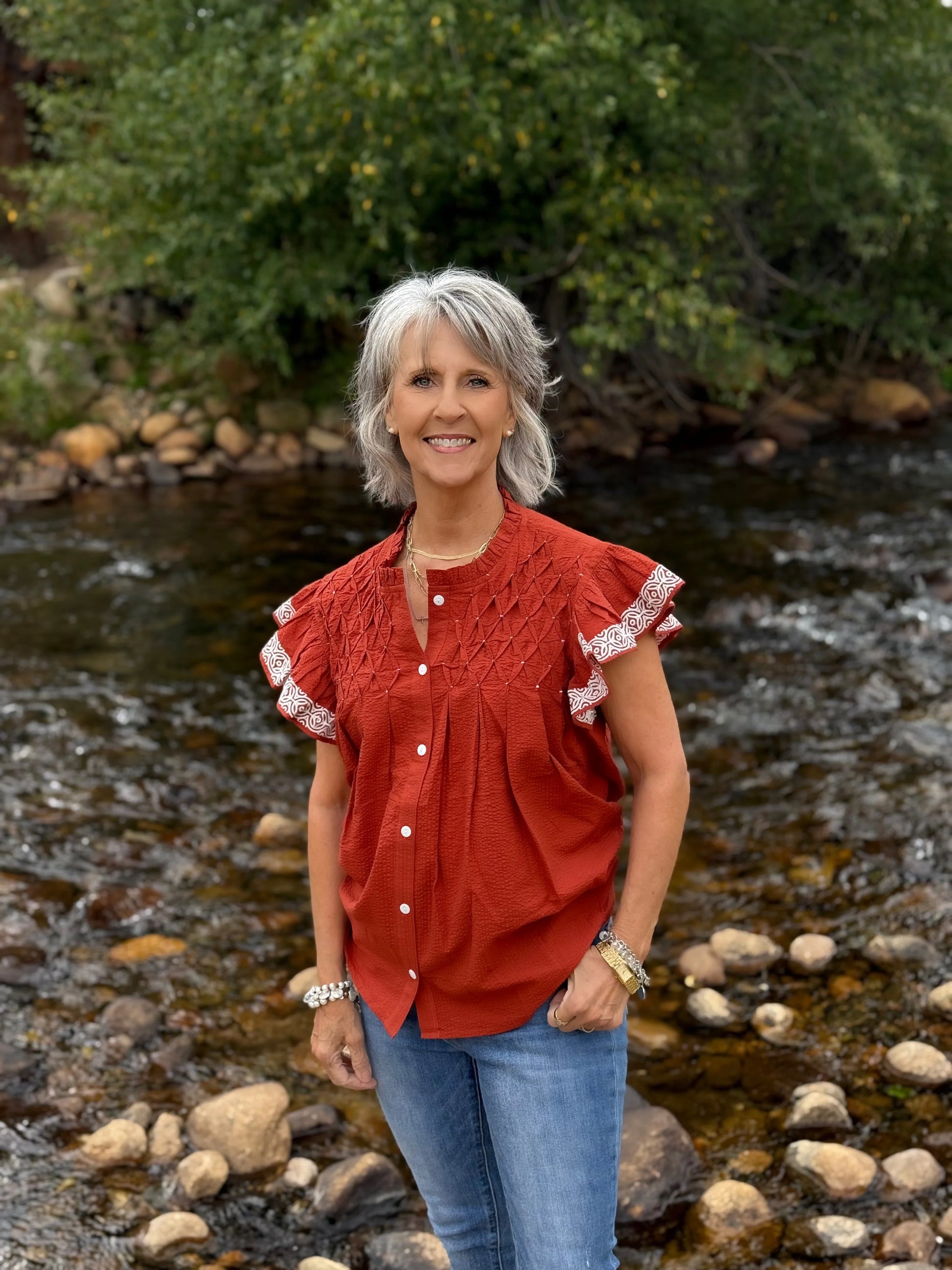 Introducing Gabrielle, the perfect top for a pop of color and effortless style. With a beautiful rust hue and delicate white trim, this top features charming ruffle sleeves and a functional button down front. Elevate your wardrobe with this must-have piece.