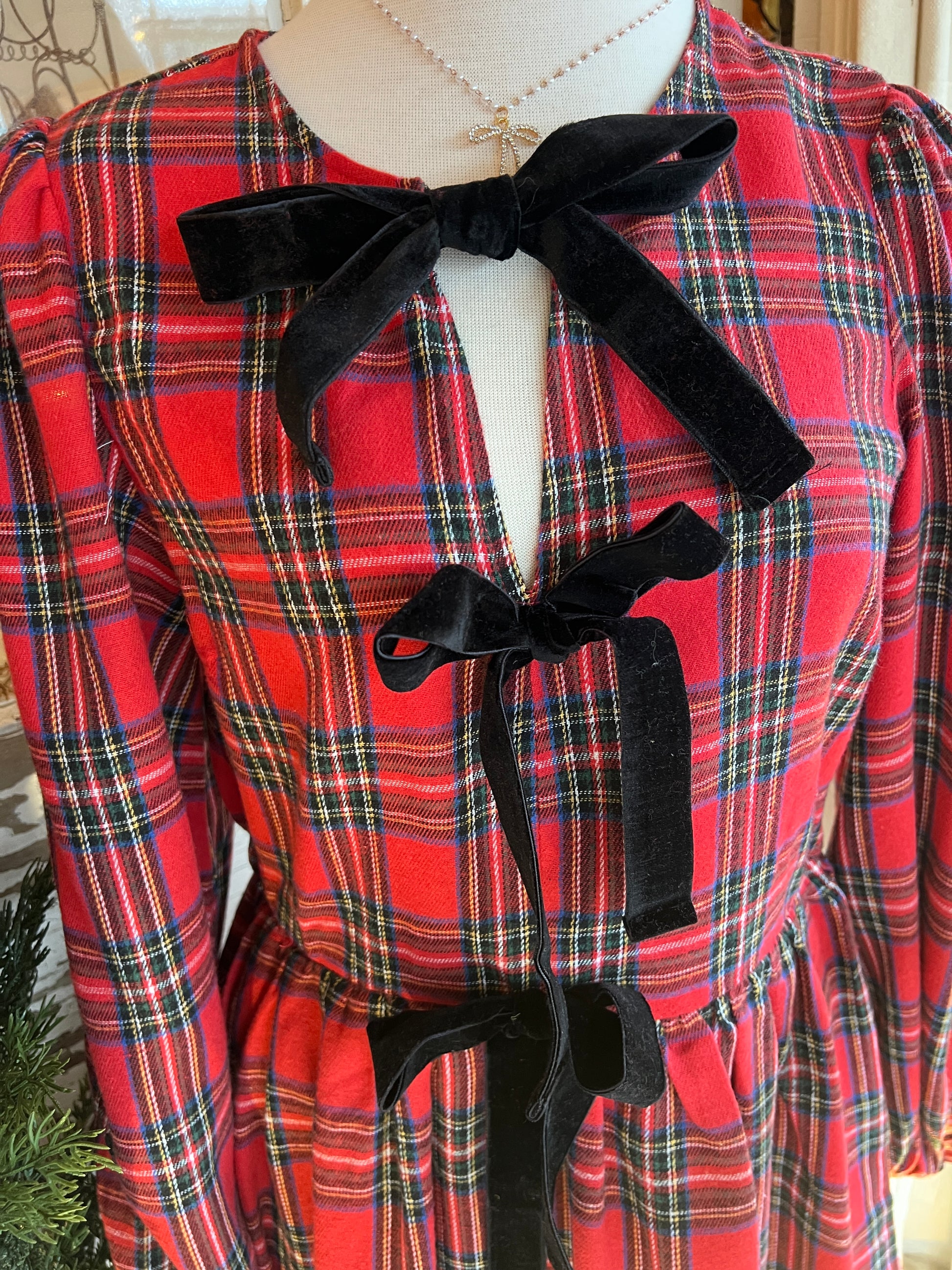 Add some festive flair to your wardrobe with Girlie Girl! This drop waist dress features Christmas plaid and velvet bows, perfect for the holiday season. The puff long sleeves add a touch of fun and style. Time to get your girlie on!