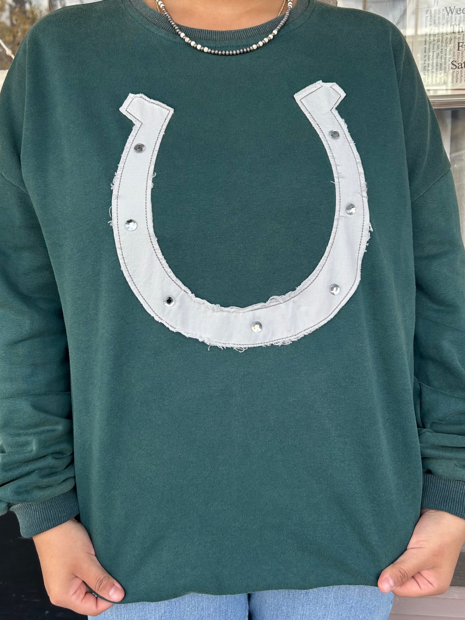Look Great in Green! This French terry sweatshirt is adorned with a raw edge cream stitched horseshoe embellished with crystals. Perfect for pairing with leggings or your favorite jeans.