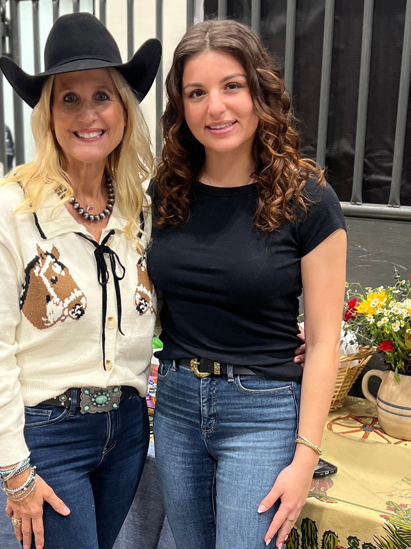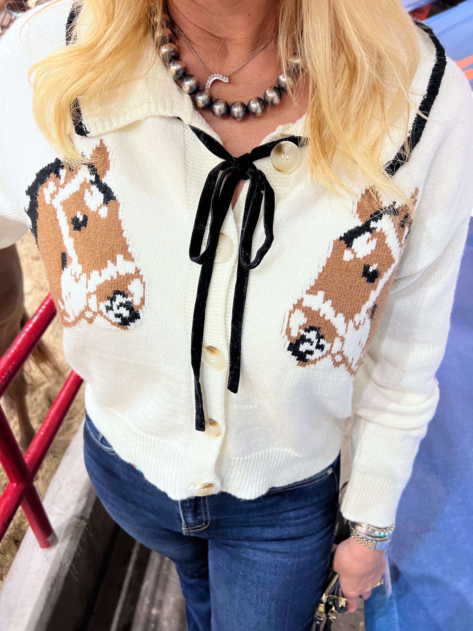 Hay Girl Hay!…cream sweater with horses on front. A sweet velvet bow tie in front with a ruffle collar make this a cowgirl’s dream. Perfect for rodeo or just to add some western flair to your wardrobe.