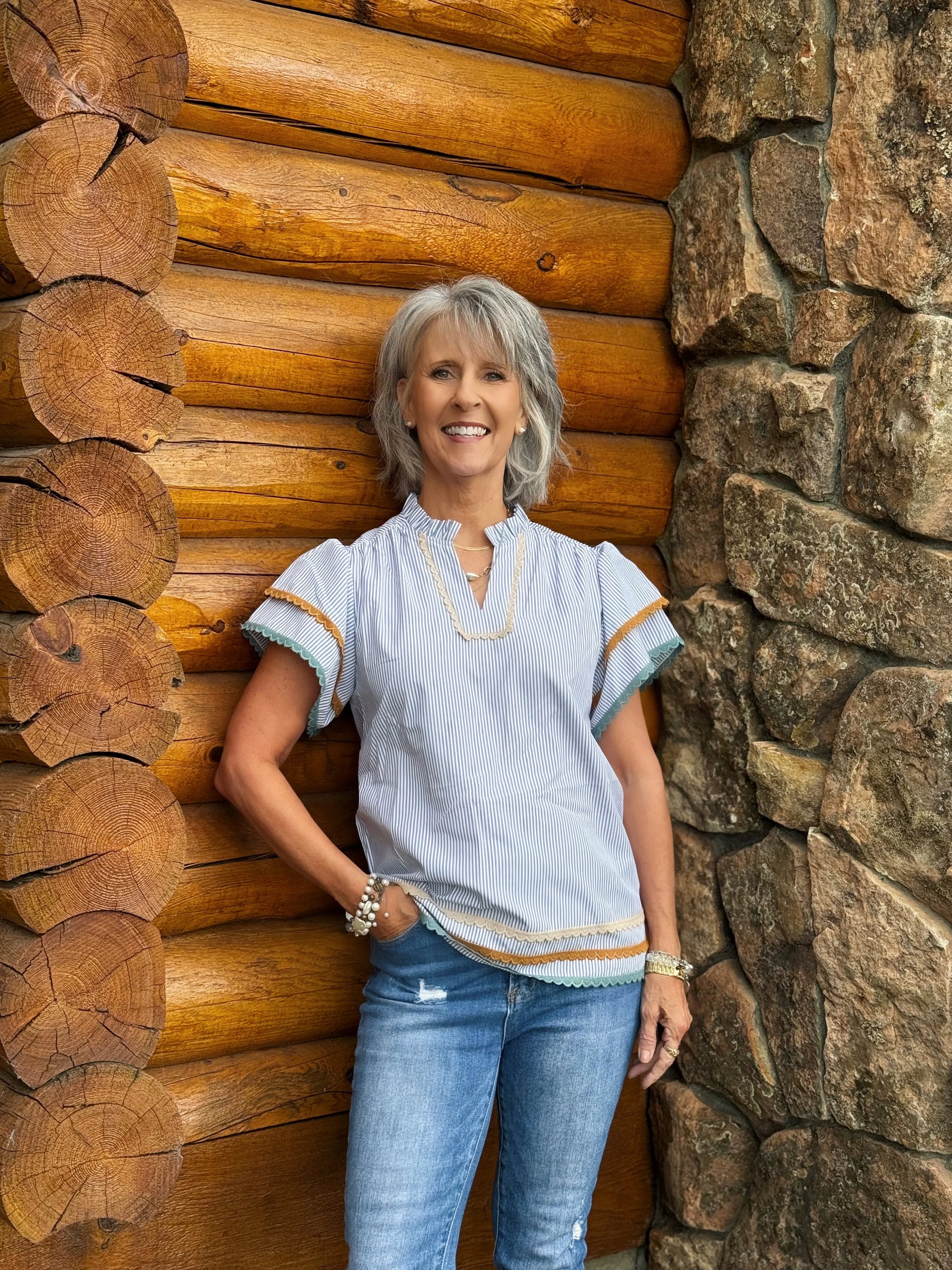 The Judd top features a subtle grey stripe pattern and colored trim details, making it a versatile and stylish addition to any wardrobe. With its V-neck design, this top is both comfortable and flattering. Perfect for any casual or dressed up occasion.