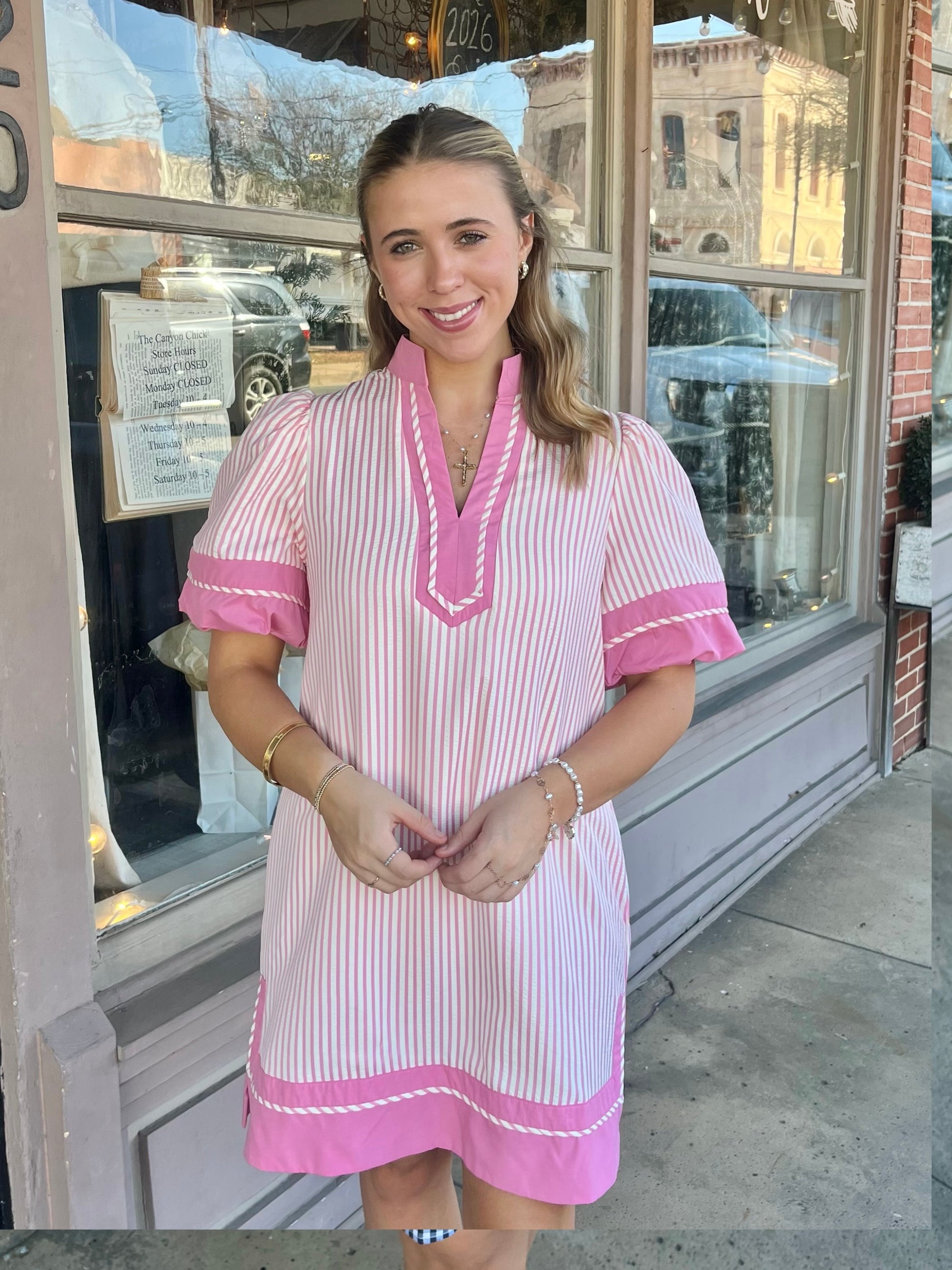 Everything is Just Peachy in this pink and white striped sleeve mini dress featuring contrast solid trim with braided accent detail at neckline, sleeves, and hem. The puff sleeves and v neck give you an elevated look which could easily be paired with heels for church or sneakers for a lunch date. Grab one today..these won’t last.