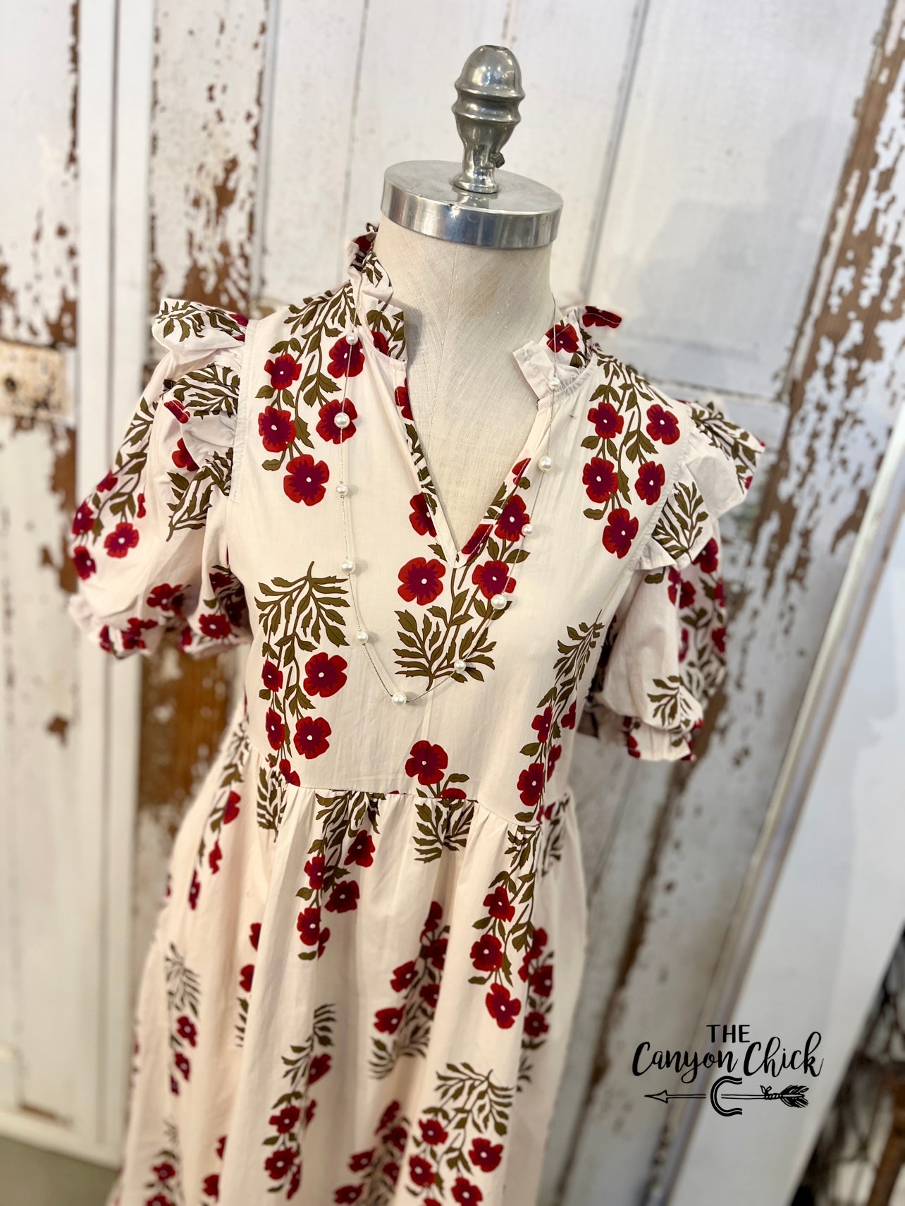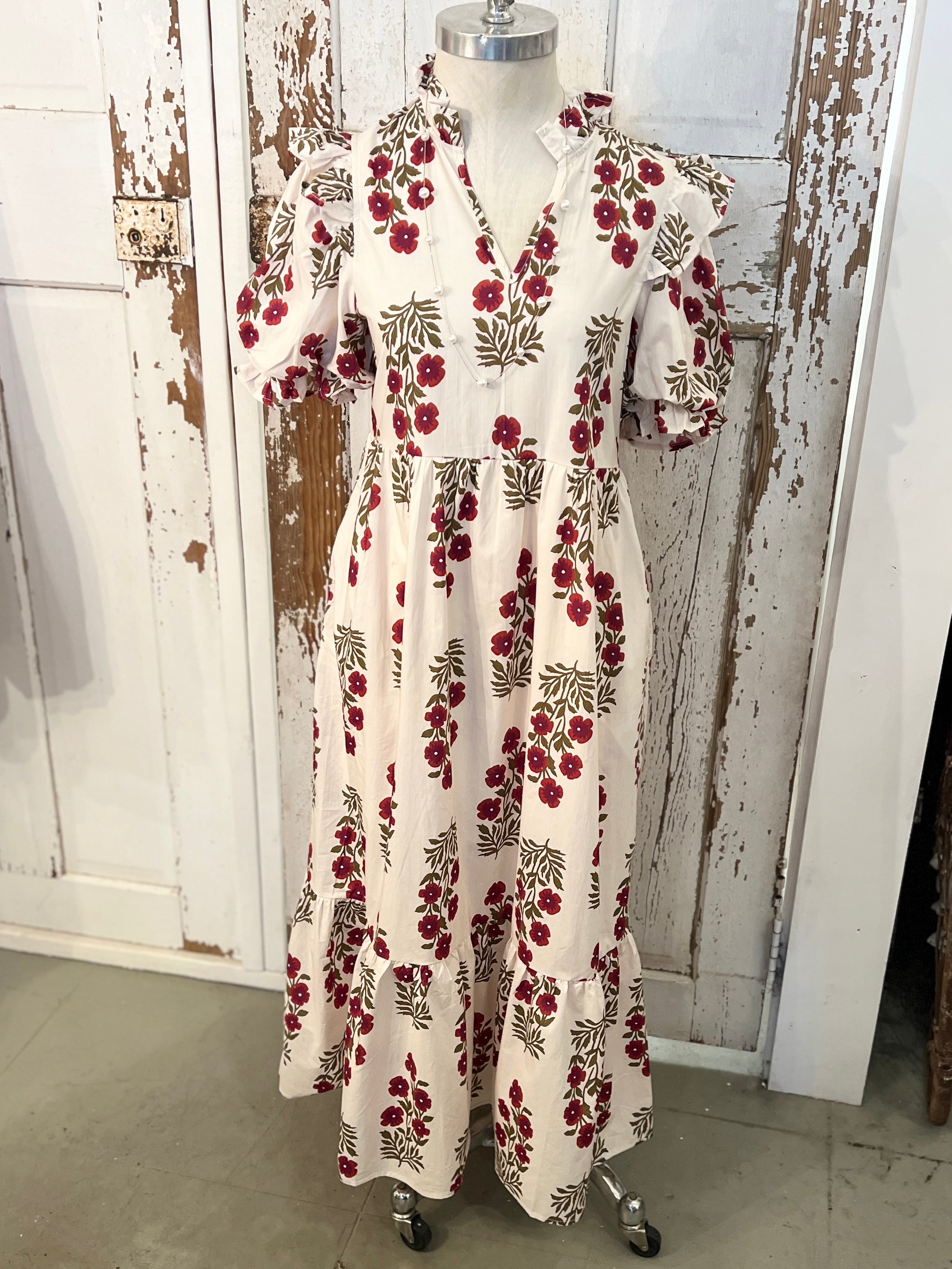 Keep It Sleek with this maxi dress. She is blooming with a playful floral print. Its breezy puff sleeves are jazzed up with elasticized ruffle cuffs, while the split neckline and shoulder ruffle accents add a touch of style . Complete with a ruffle hem and convenient side pockets!