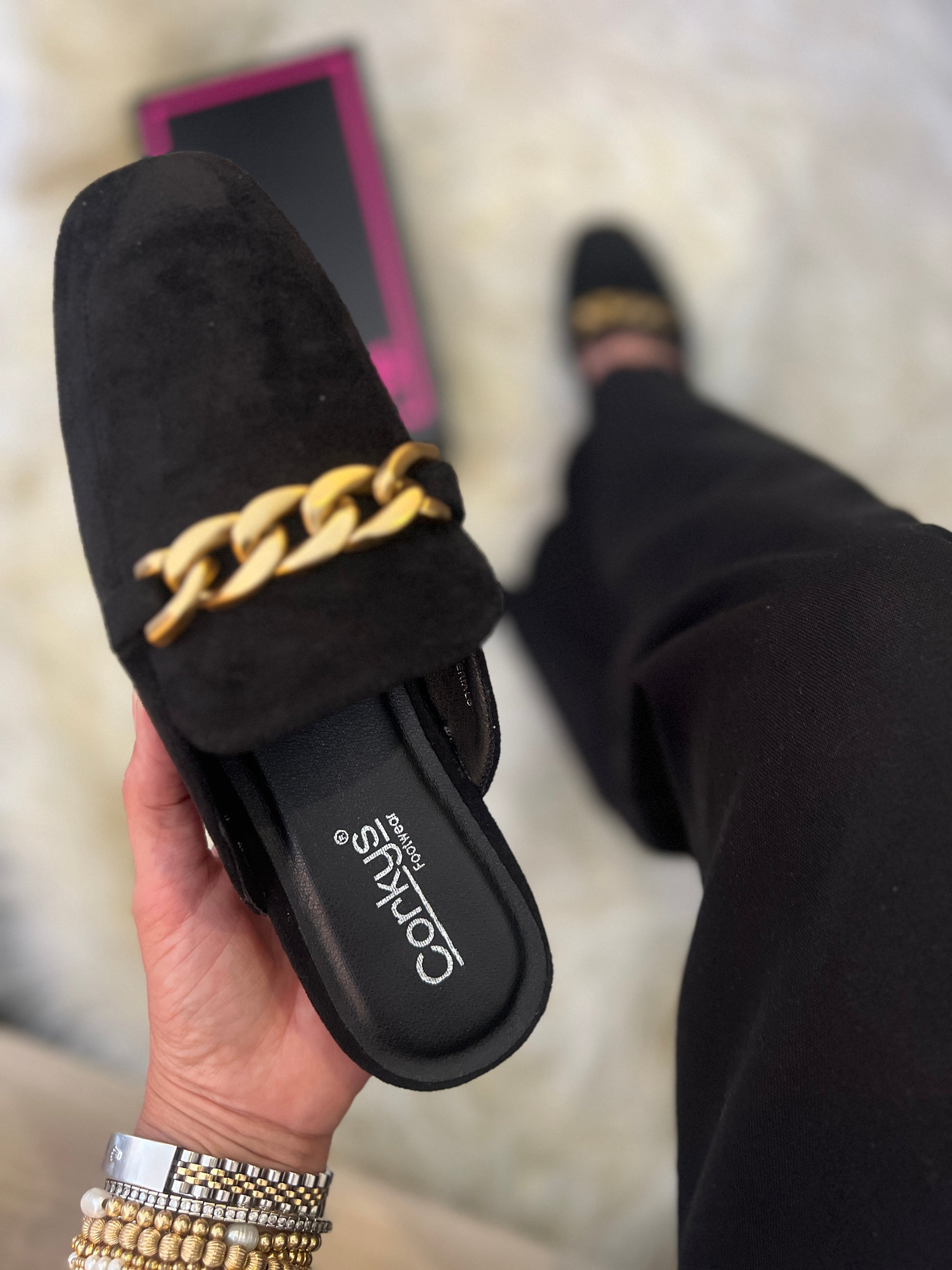 Step into style with Keepsake faux suede mules. These chic black mules feature a soft and comfortable upper with a trendy gold link accent, making them perfect for both everyday wear and special occasions. Upgrade your shoe game with Keepsake!
