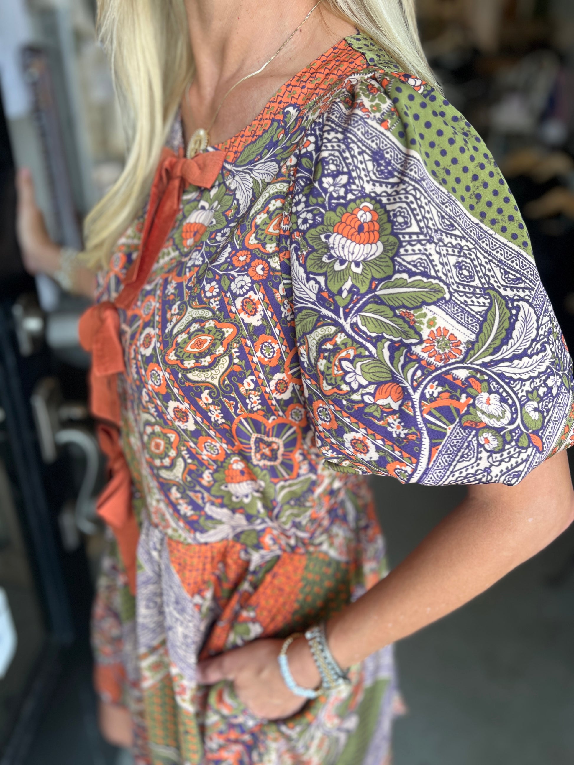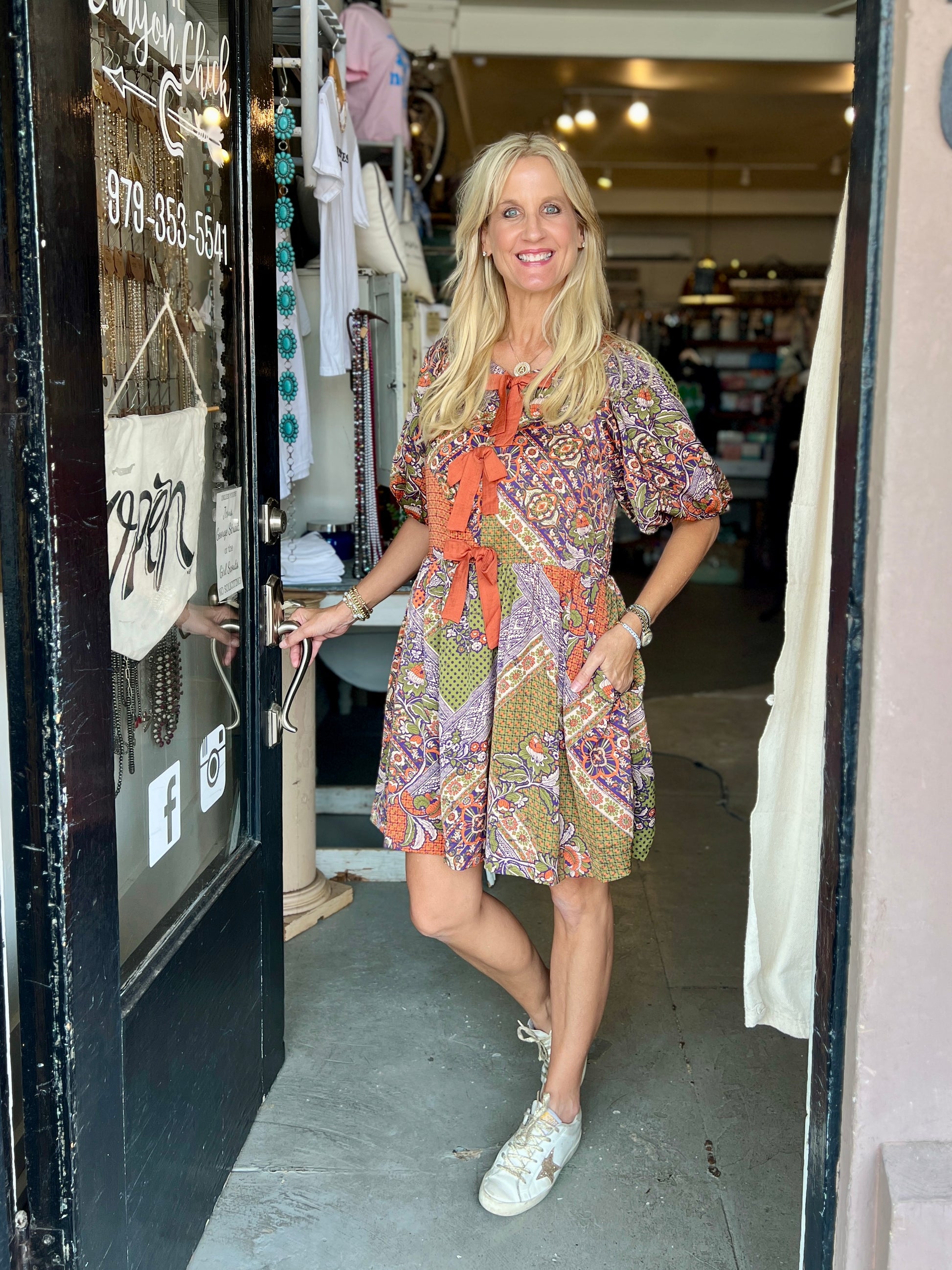 You will be Killin’It for Fall in this prined flowy and fun dress. Bow tie details at the chest and puff elasticized sleeves add just the right details. Perfect for family photos, a brunch date or church. Don’t miss out, Chick.