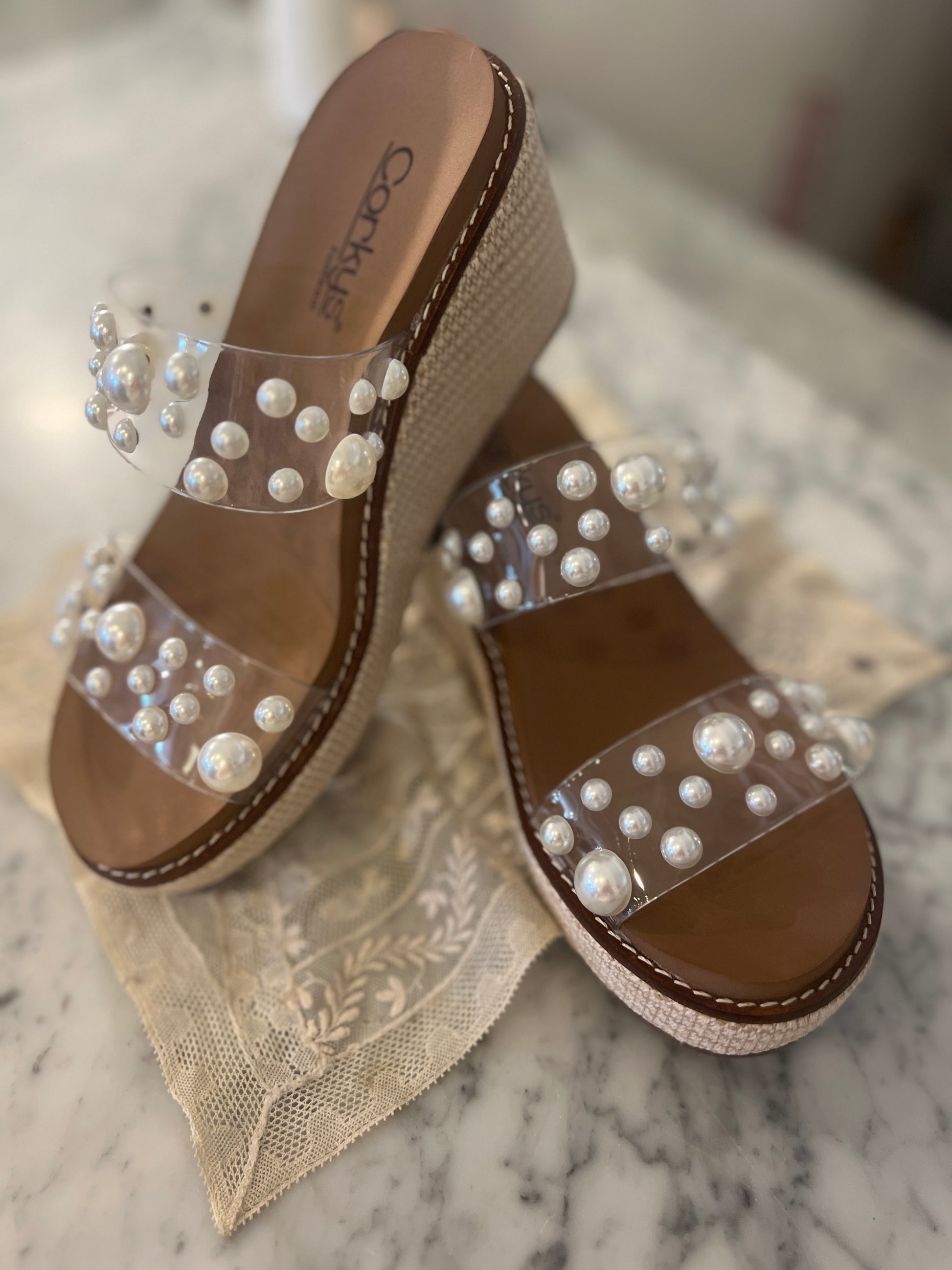 Get ready to turn heads Chick! The Look Who's Here Wedges are the playful, chic summer sandals your closet has been begging for. We are obsessed with the trendy double clear straps sprinkled with gorgeous faux pearls. Sitting on a stylish woven platform heel, these slip-on wedge sandals effortlessly elevate your favorite sundresses, cropped jeans, and vacation outfits. Best of all? They feature that unbeatable cushioned footbed for cloud-like, all-day comfort.