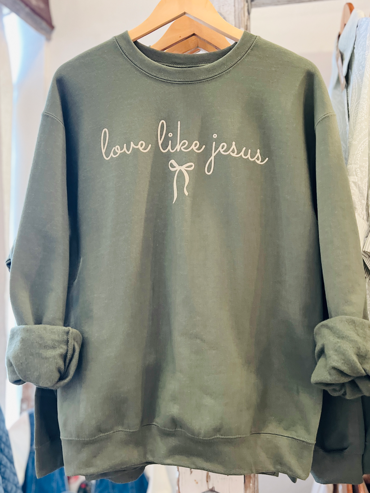 Love Like Him! Sweet sage green sweatshirt with cream graphic. Encourage others to love like Jesus on their daily walk.