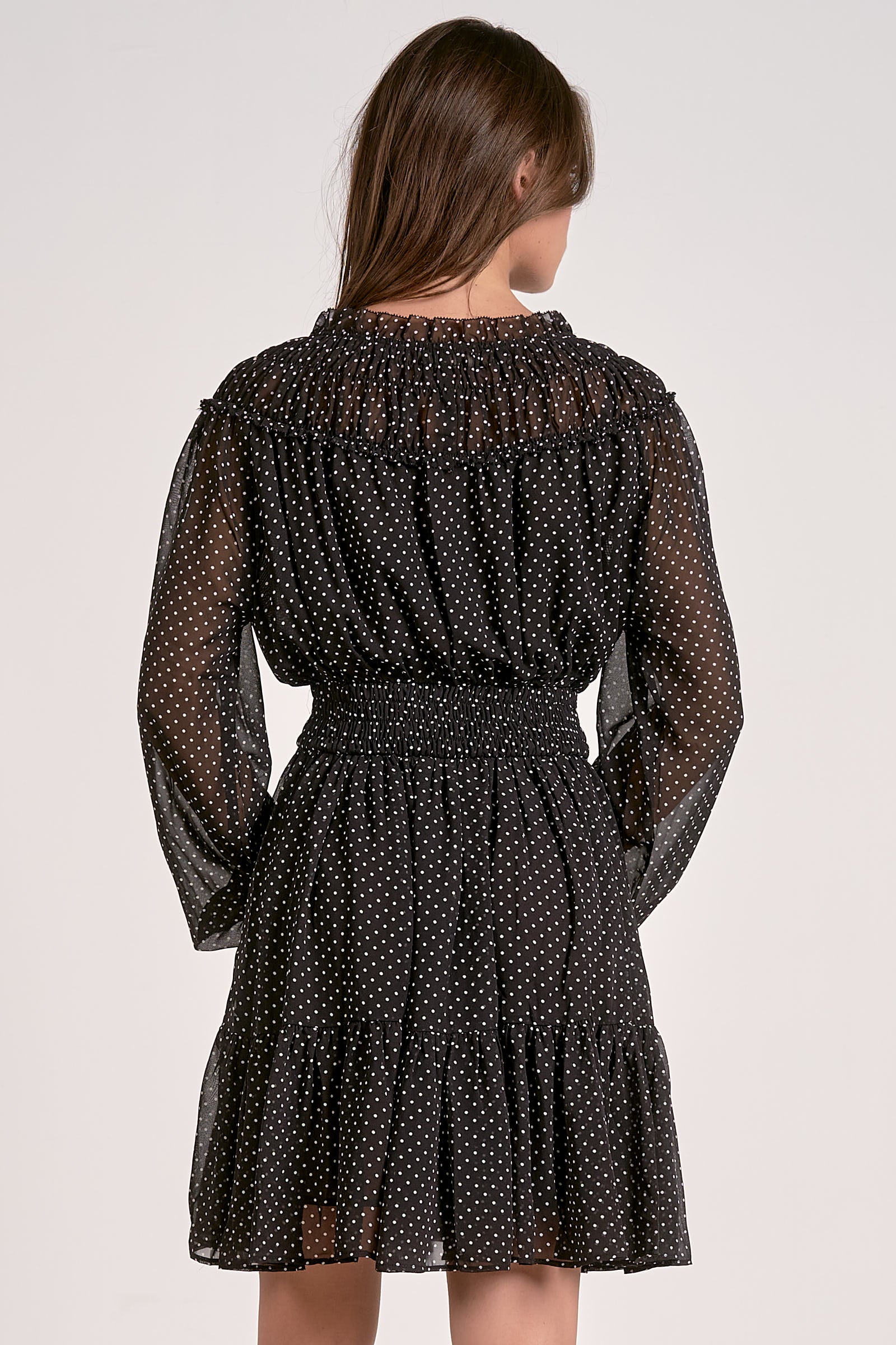 Get ready to add some fun and quirkiness to your holiday wardrobe with our Pretty Polka Dot top! With a playful polka dot print and ruffle neckline, this black long sleeve top is sure to make a statement. Perfect for those who don't take themselves too seriously.