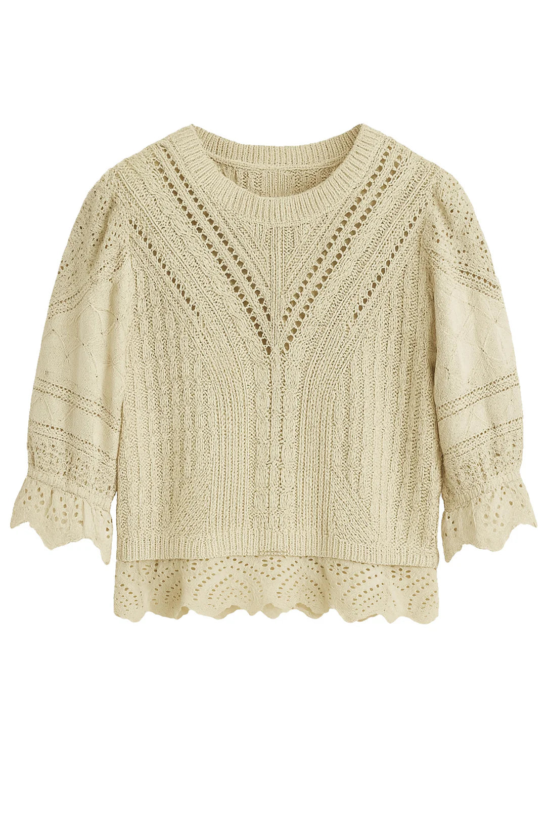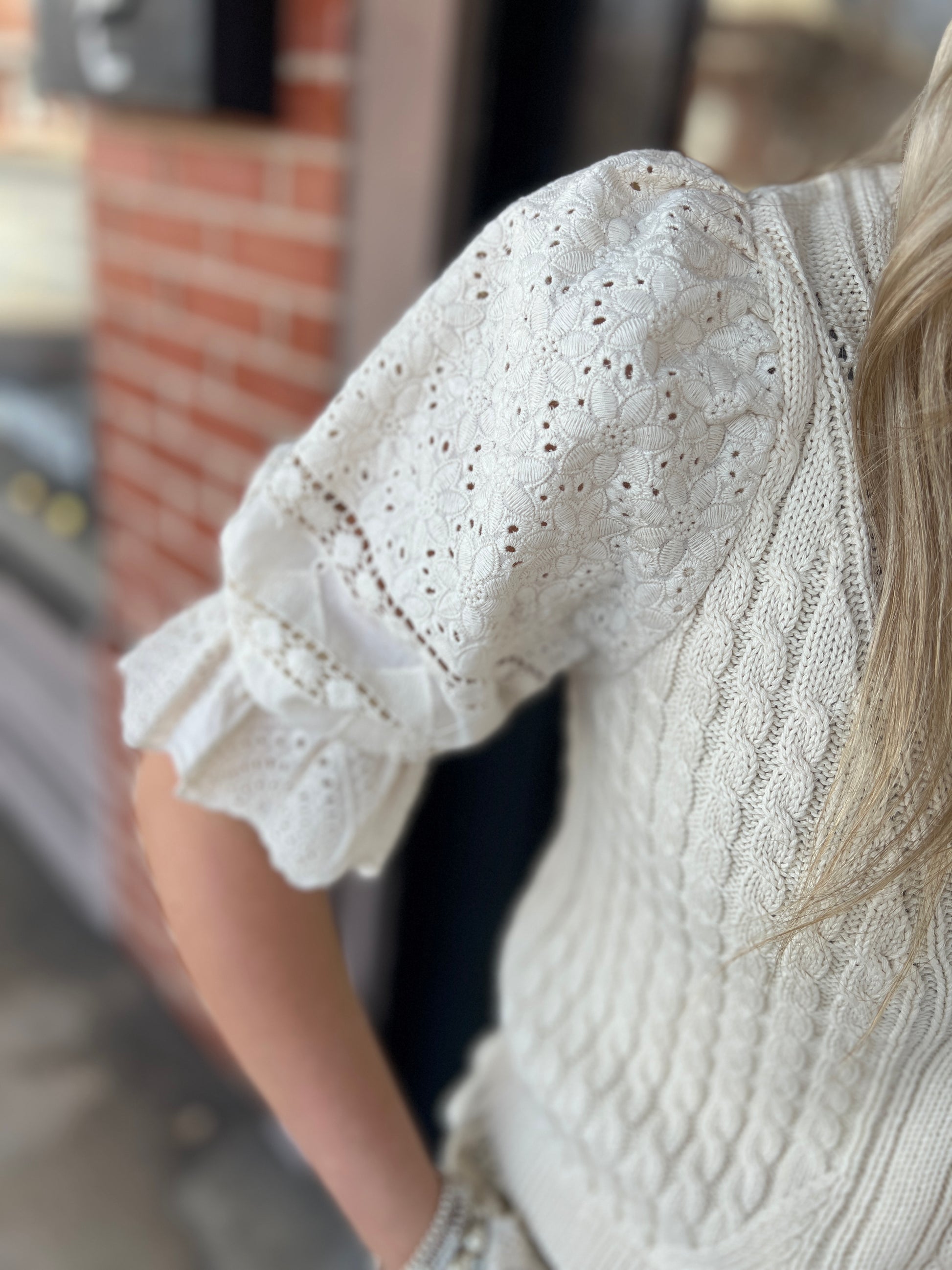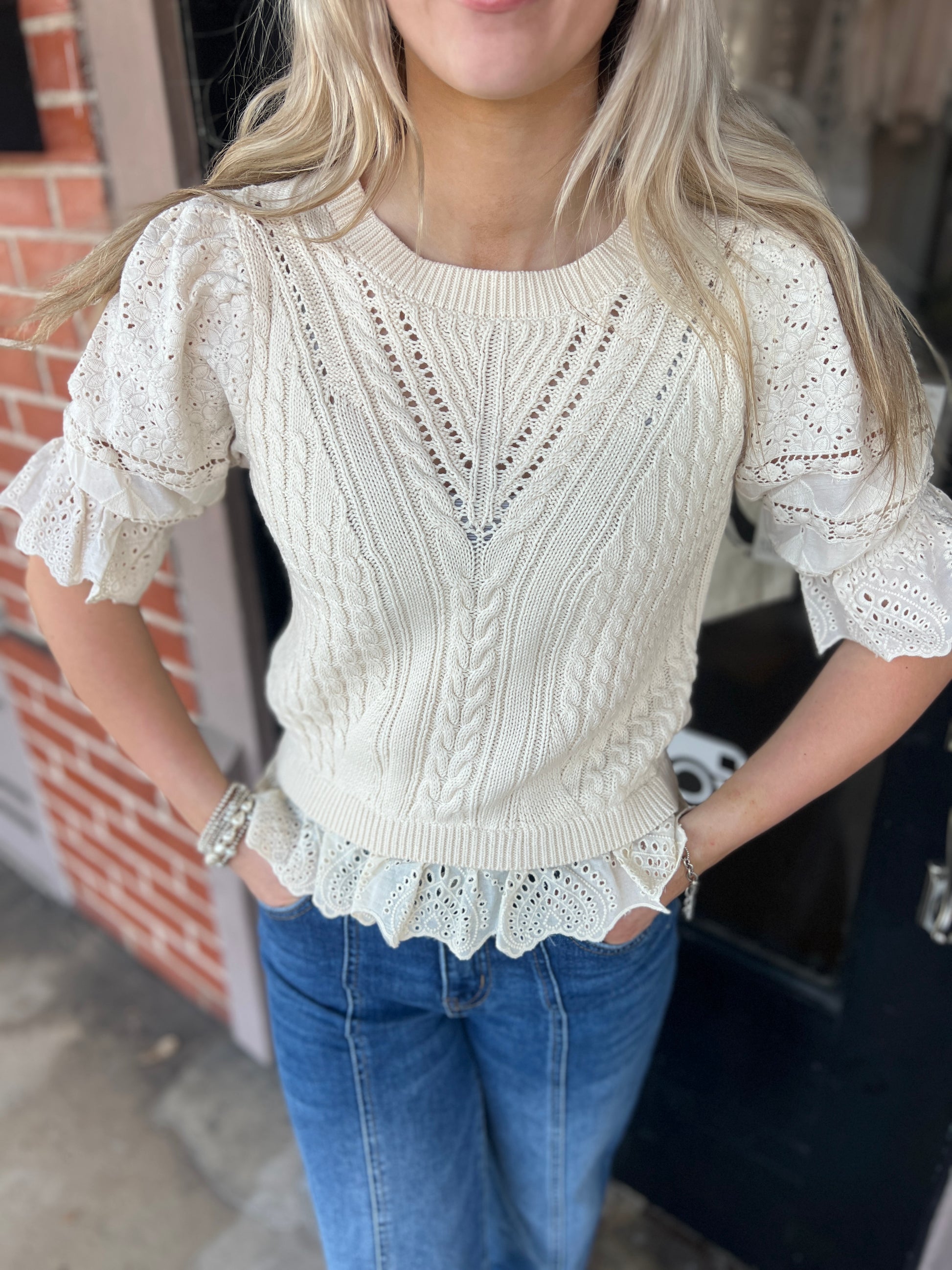 Meet the timeless Sabine sweater, Chick! A short sleeve sweater in a vintage cream color, featuring delicate eyelet ruffle lace at the bottom with a waist shaping construction to enhance your natural silhouette. She’s an instant favorite for layering or standalone wear.