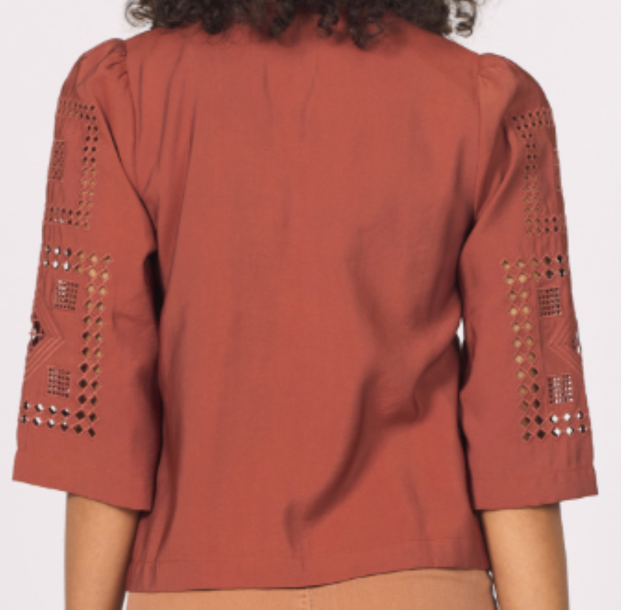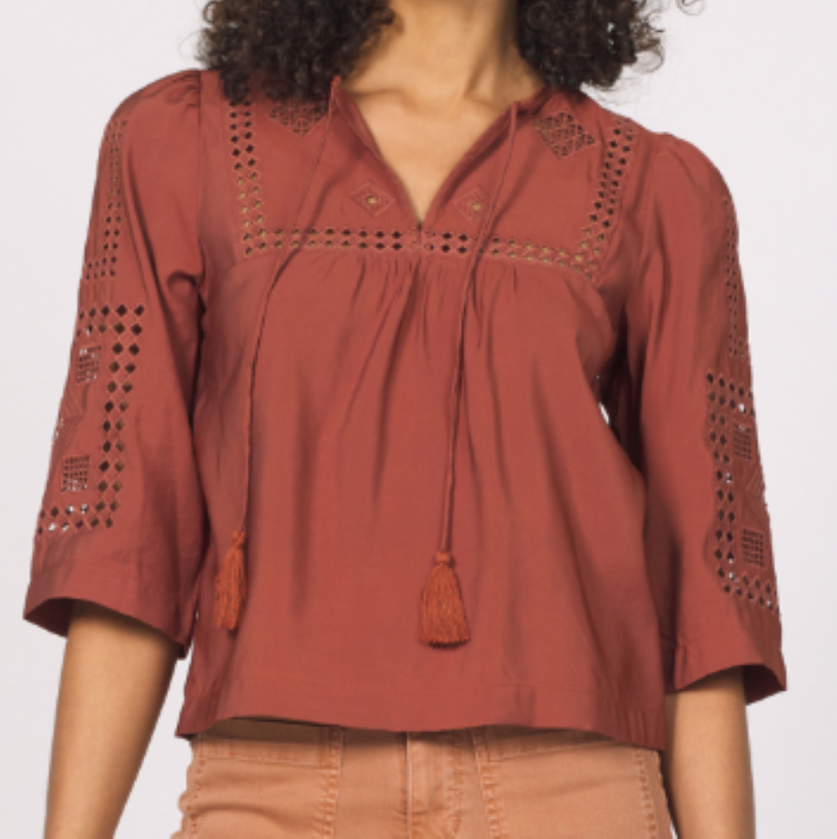 Add a splash of charm to your wardrobe with the Samaya long sleeve top. Featuring a playful tie front and delicate embroidered details on the front, this rust-colored piece brings warmth and style to any outfit. Perfect for layering or wearing on its own, it’s a fun way to brighten your day with a touch of boho flair.
