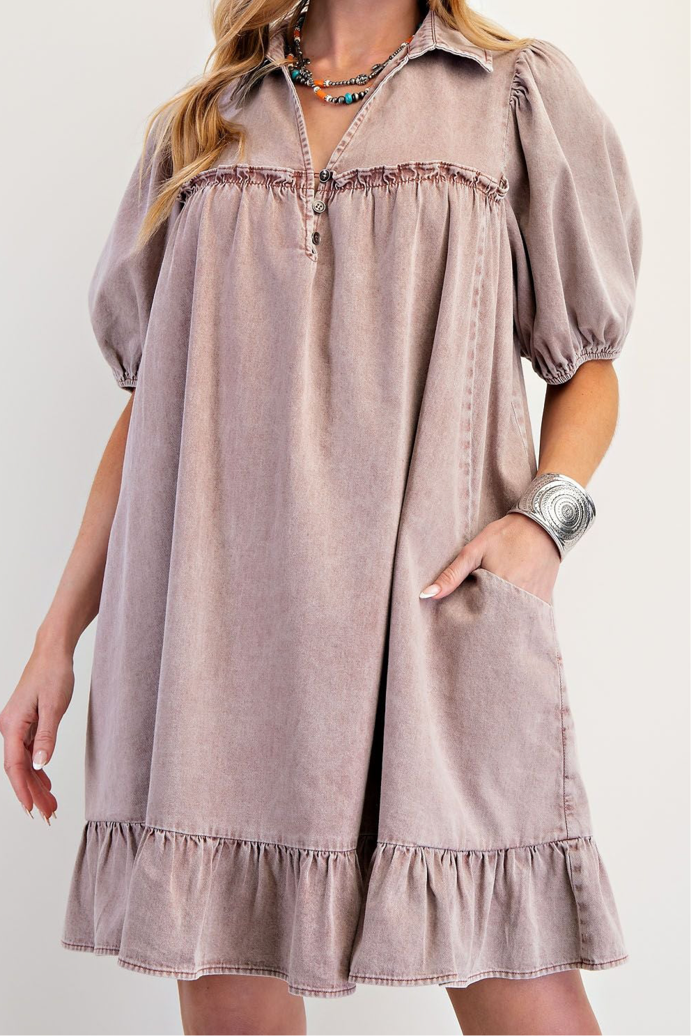 This See the Good chambray dress is washed with a playful pink hue, perfect for your unique sense of style. It features whimsical short puff sleeves, a cute ruffle bottom, and a classic collared neck. The relaxed and loose fit is comfy yet so charming.