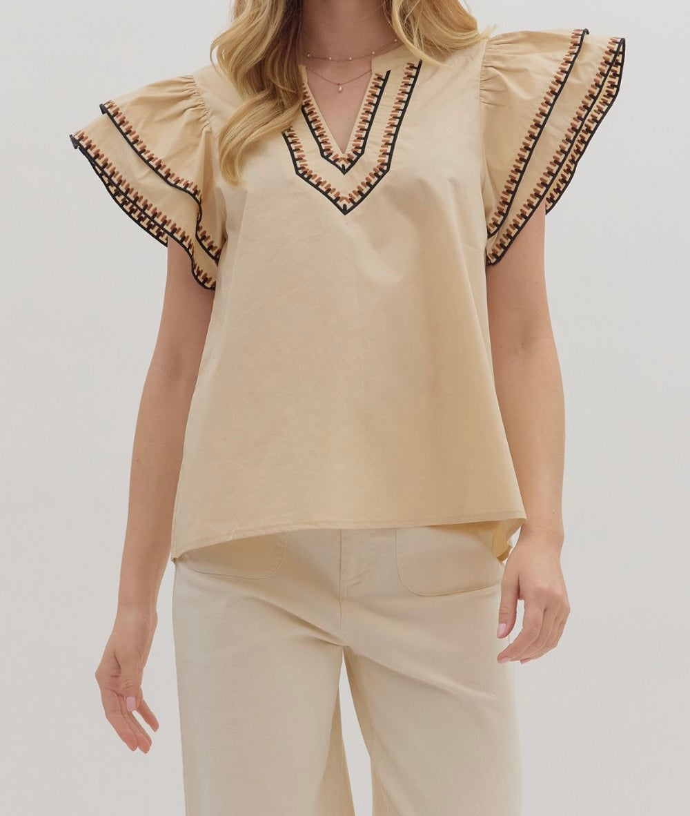Introducing Simple Times, the perfect solid layered top for any occasion. With playful ruffle flutter sleeves and a V-neck adorned with contrast embroidered trim, this top is sure to add some fun to your wardrobe. So go ahead, embrace the quirky and embrace Simple Times!