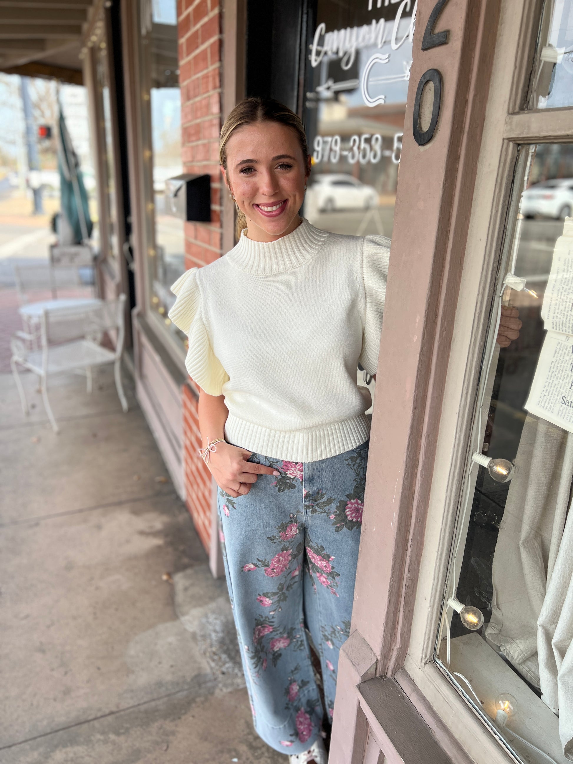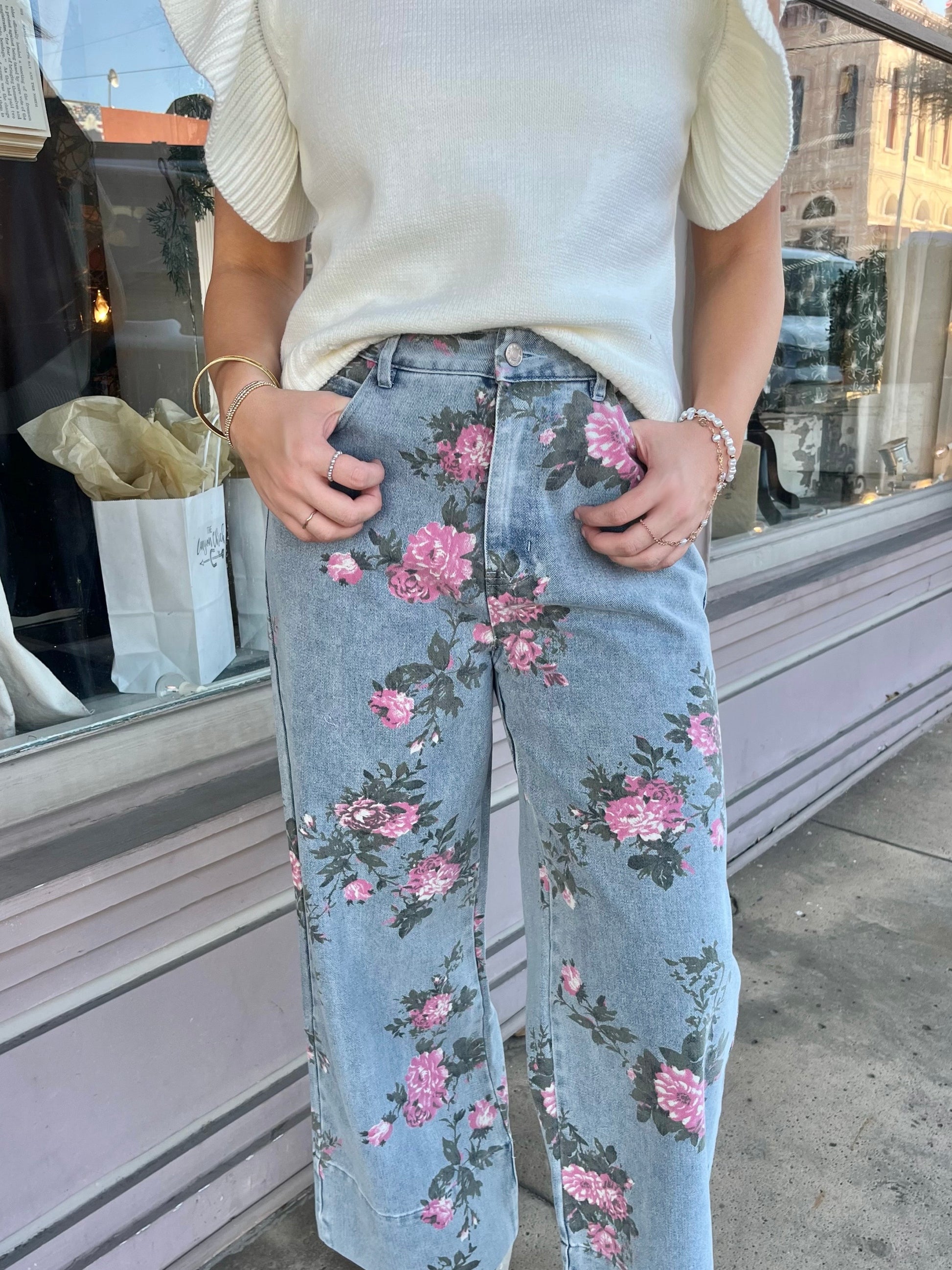 Take Me To TCC to find these denim with pink floral pants for SPRING! Paired here with our Cozy Edit Sweater.