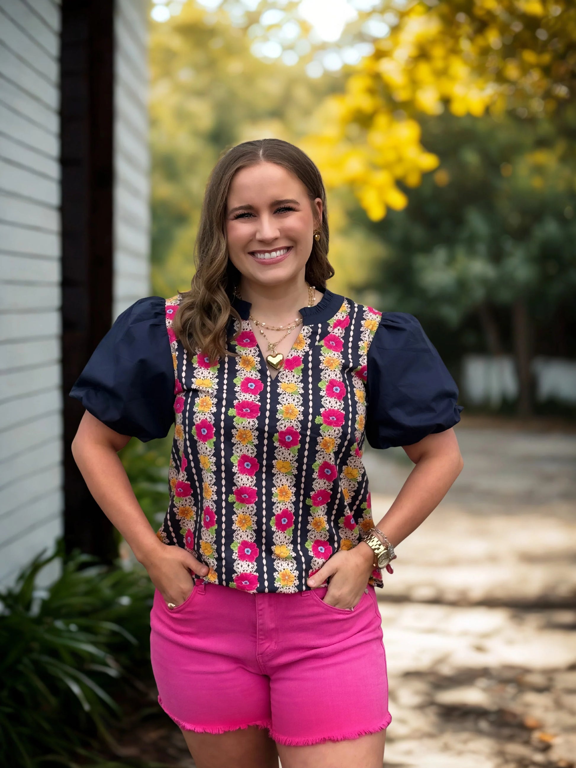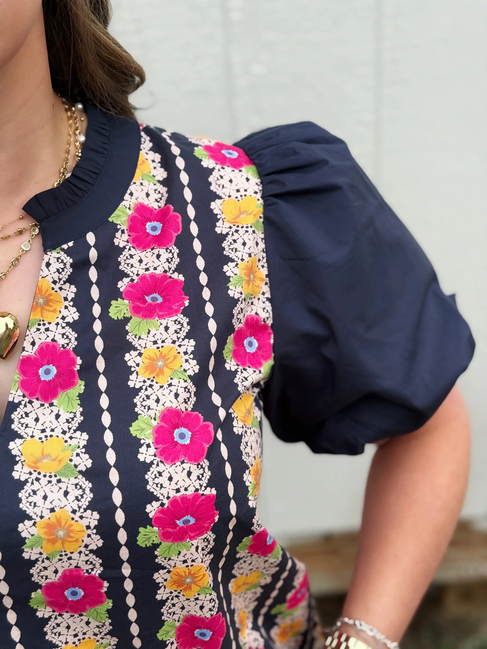 Elevate your wardrobe with the Vivian top with a printed colorful floral stripe design, solid navy sleeves and v-notched neckline.top. It features a vibrant floral stripe design that bursts with color! The solid navy sleeves and v-notched neckline add a touch of style and fun. This versatile piece is perfect for any occasion, inspiring confidence and joy every time you wear it!