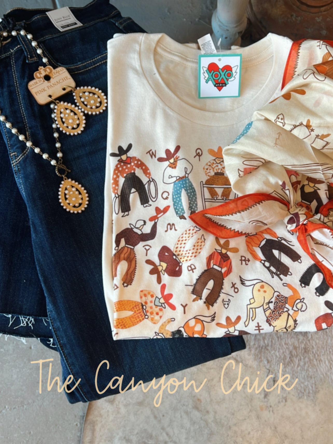 Hey Cowboy! The Way Out West tee is full of cowboys and horseback riding of the west. Branded and produced by our favorite XOXO Art Co. Don’t miss adding this western graphic to your collection.