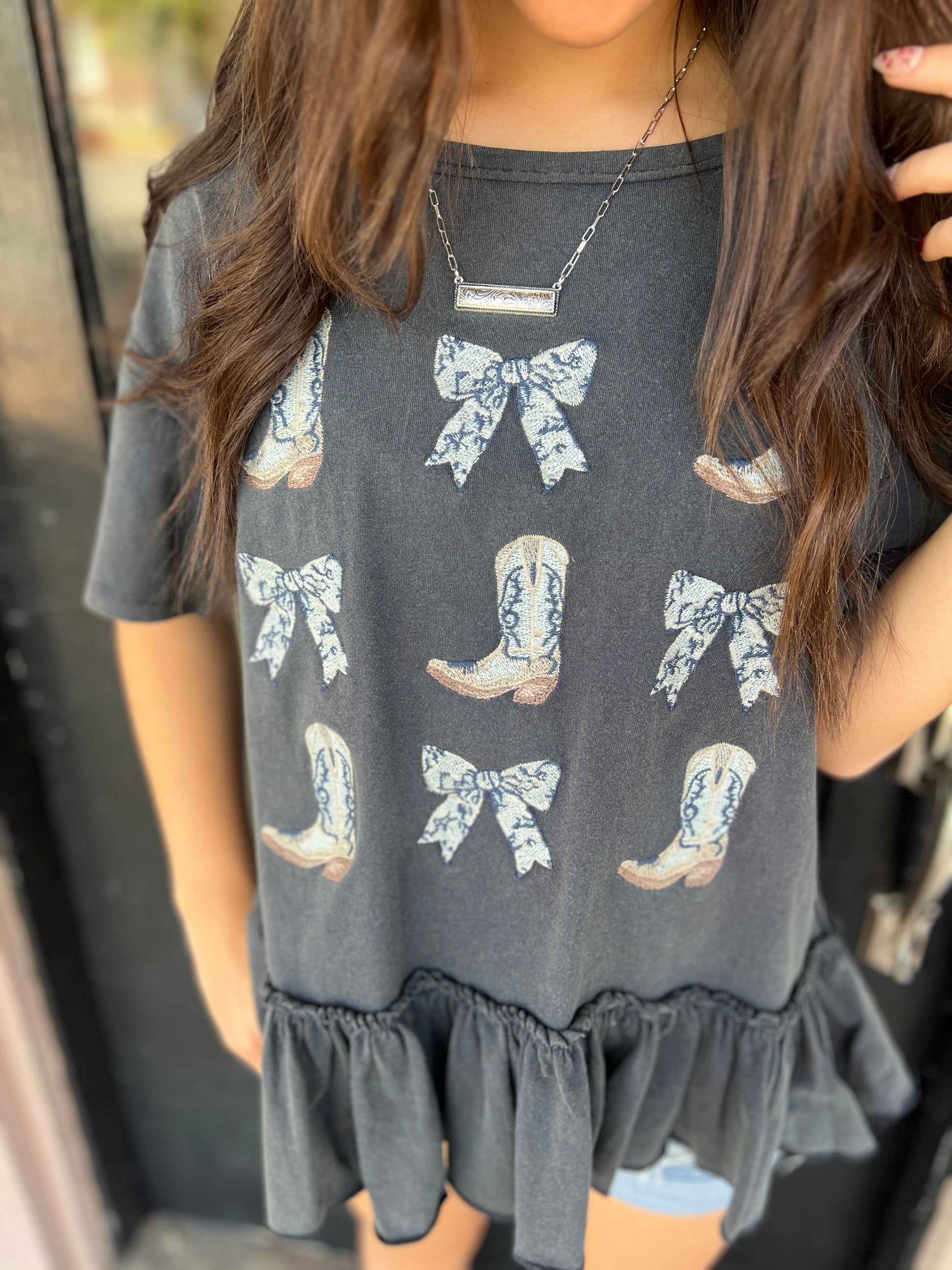Don’t wait on this one. The Western Cutie with embroidered boots and bows won’t last long. Made of a comfy fabric short sleeves and a flirty peplum. Pair with shorts or jeans and your favorite boots. Your a cute COWGIRL ready for fun.